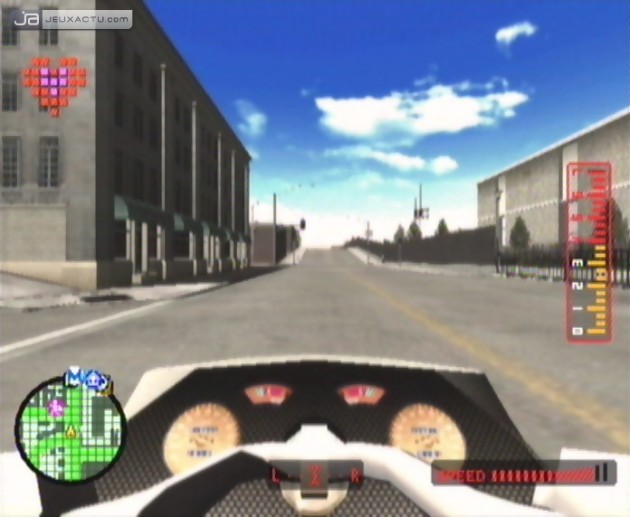 Une sorte de GTA donc mais en version allégée, aussi bien dans son approche qu’au niveau de la réalisation. Bien moins imposante que le Liberty City de GTA III, Santa Destroy manque surtout de vie. Les rues sont généralement vides et les quelques passants qui circulent ici et là se résument à marcher bêtement, et ne se donnent même pas la peine de fuir la route lorsque Travis débarque à toute berzingue avec son tank à deux roues. A l’instar de la série de Rockstar Games, le jeu peut s’appréhender de deux façons. La première, qui consiste à enchaîner les missions obligatoires, permet d’avancer dans le jeu et suivre les péripéties de notre otaku fougueux. La seconde lecture, plus libre, permet de prendre du bon temps et de profiter des avantages que peut nous offrir Santa Destroy. S’il est évidemment de bon ton de passer à la boutique vintage pour s’acheter le dernier t-shirt à la mode ou la dernière paire de pompes qui va bien, Travis peut aussi s’amuser à sculpter son corps à la salle de muscu, ramasser les détritus au sol pour jouer son rôle de bon citoyen, tondre la pelouse d’un voisin ou bien encore aider un commerçant à récolter des noix de coco. Une façon comme une autre de combler le vide.