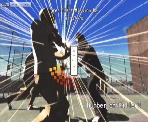 Mais s’il y a un bien un point à retenir de No More Heroes, au-delà de sa touche graphique exceptionnelle ponctuée de pixel-arts et de ses dialogues corrosifs, c’est bien sa jouabilité efficace, appuyée par un système de combat ultra chiadé. En effet, à l’heure où la prise en main dite révolutionnaire de la Wii fait débat, Grasshopper Manufacture assume ses différences et ose prendre le marché à contre-courant. Contrairement aux réflexes imposés par la Wii, les attaques dans No More Heroes ne se réalisent pas en gesticulant la télécommande comme un demeuré pour tenter de sortir un coup valable. Ici, tout est simplifié à son maximum et c’est la touche A qui fait office de nerf de la guerre. On se contente alors d’appuyer sur ladite touche pour enchaîner les attaques, et lorsque la barre de vie de l’adversaire approche du néant, il est possible de l’achever d’un simple coup de poignet, en suivant le pictogramme qui s’affiche à l’écran. Un finish him plutôt jouissif qui se conjugue à un système de locke qui permet de cibler sa cible rapidement, de tourner autour d’elle mais aussi d’esquiver les attaques en réalisant des roulés boulés sur les côtés. Mieux, en appuyant sur la gâchette B au moment d’étourdir l’ennemi, il est alors possible de réaliser quelques mouvements de catch (le sport favori de Travis, rappelez-vous) à l’aide de la Wiimote et du Nunchuk. L’interactivité avec la Wiimote va encore plus loin dans le sens où il faudra parfois se servir de la zappette comme téléphone en approchant le haut-parleur à son oreille pour écouter une conversation. Inattendu et épatant.