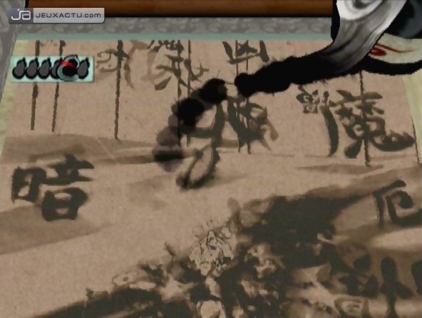 Diriger Amaterasu est un réel plaisir, de son sillon apparaîtra de la végétation et faire sprinter notre boule de poils vous permettra donc d’esquisser une nature fleurie. De ses sauts tomberont des feuilles d’automne et parfois un tracé d’encre. Après une prise en main assez rapide, vous pourrez goûter au paradoxe de l’action associé à la zénitude de la calligraphie. Maintenir la touche R1 permet de figer le décor en calligraphie sur un fond de papier traditionnel au toucher presque perceptible du traditionnel papier de riz. Pendant ces instants où le temps est arrêté, il sera possible d’admirer ces jetés d’encre qui composent les illustrations sous tous les angles, et tel un artiste fougueux y attoucher sa touche personnelle. Ainsi, parmi les activités possibles vous régénérerez et guérirez les arbres malades, nettoierez les terres des résidus maléfiques, et apprendrez à faire le jour et la nuit. Vous pourrez utiliser vos talents de coloriste mono-couleur lors de quêtes subsidiaires ou lors de combat en badigeonnant les personnages, mais également jouer au samouraï au trait vigoureux (d’un trait horizontal, vous assénez un coup similaire au sabre) ou à l’artificier pour découvrir des trésors cachés.