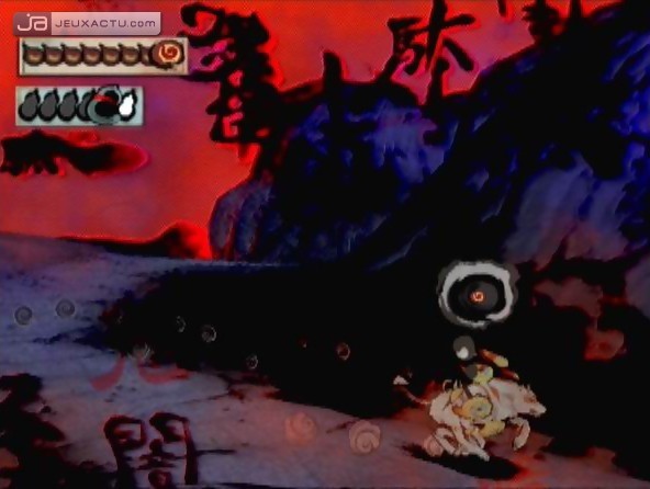 Diriger Amaterasu est un réel plaisir, de son sillon apparaîtra de la végétation et faire sprinter notre boule de poils vous permettra donc d’esquisser une nature fleurie. De ses sauts tomberont des feuilles d’automne et parfois un tracé d’encre. Après une prise en main assez rapide, vous pourrez goûter au paradoxe de l’action associé à la zénitude de la calligraphie. Maintenir la touche R1 permet de figer le décor en calligraphie sur un fond de papier traditionnel au toucher presque perceptible du traditionnel papier de riz. Pendant ces instants où le temps est arrêté, il sera possible d’admirer ces jetés d’encre qui composent les illustrations sous tous les angles, et tel un artiste fougueux y attoucher sa touche personnelle. Ainsi, parmi les activités possibles vous régénérerez et guérirez les arbres malades, nettoierez les terres des résidus maléfiques, et apprendrez à faire le jour et la nuit. Vous pourrez utiliser vos talents de coloriste mono-couleur lors de quêtes subsidiaires ou lors de combat en badigeonnant les personnages, mais également jouer au samouraï au trait vigoureux (d’un trait horizontal, vous assénez un coup similaire au sabre) ou à l’artificier pour découvrir des trésors cachés.