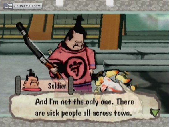 Okami s’est offert un scénario bien ficelé calé sur le hasard et la destiné. Des caricatures attachantes et des rencontres de tout genre dessinerons un sourire ou même une béatitude sur bien des lèvres. Ainsi la sérénité qui entoure la culture japonaise est fortement ressentie grâce à la représentation de cycles de vie au travers de l’habile palette intergénérationnelle, mais aussi l’importance dégagée du fait que chaque chose occupe une place précise dans un ordre travaillé. Le voyage perpétuel d’Amaterasu au cœur d’un monde au mysticisme et folklore attachant correspond bien à celui qu’un loup solitaire peut entreprendre. Notre Okami n’en est pas moins un animal dont le cousin est le meilleur ami de l’homme : il aboie, s’allonge de temps en temps, creuse pour déterrer une récompense, et s’étonne avec une naïveté naturelle de ses découvertes. Amaterasu reste indomptable et se permettra des petits travers bien compréhensibles comme ceux de mordre par curiosité ou de se prendre de compassion envers les autres animaux en les nourrissant. Issun, de par ses interventions cocasses dédramatise le côté mélancolique en apportant une touche légère par ses commentaires assez poilants et parfois même salaces. On ne manquera pas de remarquer que Okami a beaucoup de point commun avec le Zelda de Nintendo. Comme Link, Amaterasu part en quête pour sauver le monde, résout des énigmes, fait évoluer son personnage dans un vaste monde, casse des pots ou se sert dans la nature pour récupérer du pécuniaire ou des vivres, a un temps de trempette limité et peut même pêcher. Cependant le ton des dialogues ainsi que les commentaires d’Issun ajoute une pointe d’humour plutôt destinée à distraire un public adulte. Les capacités en énergie et de réserves pourront évoluer en fonction des orbes de bonheur accumulée. Les richesses emmagasinées vous permettront d’acquérir des biens auprès des nombreux marchands présents sur tous les sites (eh oui les échanges commerciaux n’ont pas de frontières), ou de vous payer des cours auprès du vieux maître et ainsi développer les aptitudes physiques et compétences au combat.
