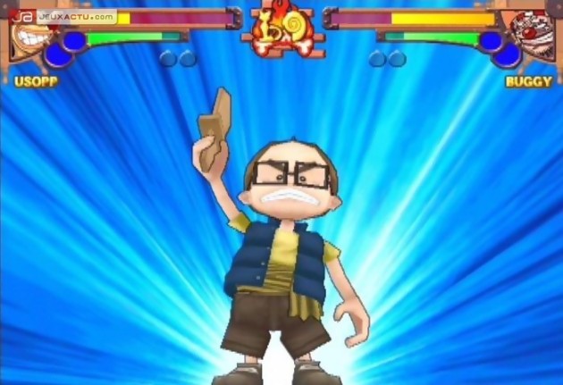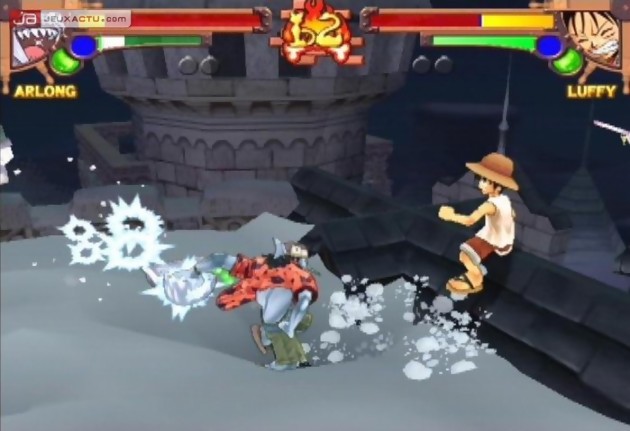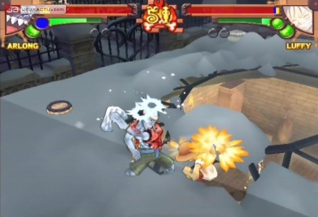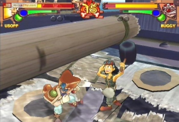 Bien évidemment pour un manga de la trempe de One Piece, il était impossible pour Bandai de passer à côté du jeu de baston, le genre idéal pour retranscrire avec une certaine fidélité l’histoire de la série ou du manga, c’est vous qui choisissez. Pour mettre en œuvre ce pugilat, Banda a fait appel à GANBAR!ON, connu pour avoir mis au monde le pas trop mal Jump Super Stars sur DS. Mais pour varier un peu leur quotidien, GANBAR!ON a décidé d’aller puiser leurs inspirations du côté de Power Stone, le sympathique jeu de combat signé Capcom et sorti sur Dreamcast en 1999. Pour ceux qui n’auraient pas encore tilté, sachez que les combats ne se déroulent pas de la même manière que les jeux de baston en 3D habituels. Tout d’abord, l’angle de vue se est aérien même si par moments, la caméra n’hésitera pas à se rapprocher es protagonistes pour amplifier l’impact de certains coups. Ensuite, le joueur est totalement libre de ses déplacements dans la zone de combat, un espace qui sera truffé de bonus et autres pièges qui participeront également au résultat du match. L’idée plutôt sympathique au départ et qui fonctionne à merveille dans Power Stone montre rapidement ses faiblesses. Pour commencer, les décors sont peu inspirés et même si on retrouve pas mal d’éléments issus de l’univers de la série, on aurait souhaité voir des environnements plus excitants en matière de level design et surtout un minimum d’interactions. De manière générale, ces décors se contentent de s’étaler sur un seul niveau alors qu’il aurait été plus intéressant de pouvoir évoluer dans les hauteurs ou pourquoi pas détruire un sol pour passer au niveau inférieur. Autant d’idées qui avaient déjà été vues dans la série Power Stone et qui ne trouvent pas preneur chez One Piece Grand Battle. C’est bien dommage car d’autres trouvailles tels que la possibilité de faire appel à un personnage tiers (façon Striker) apporte un peu de peps aux combats.