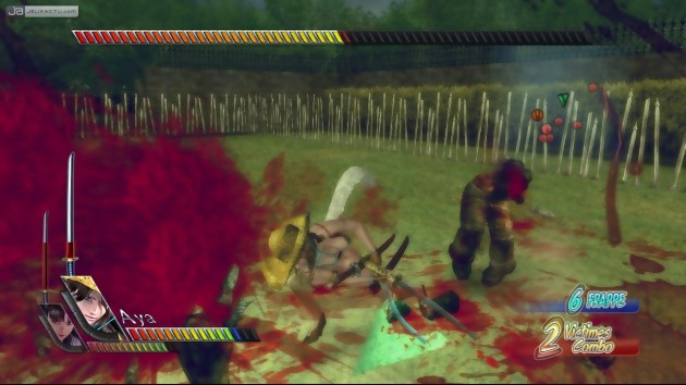 Trois personnages seront jouables au fur et à mesure des niveaux. Tout d’abord, vous incarnerez les sœurs Imichi, Aya et son maillot de bain rikiki puis Saki, dont la tenue type d’écolière japonaise ravira à coup sûr les otakus. Plus tard, elles seront rejointes par la mystérieuse Emma qui n’a pas son pareil pour manier les armes à feu et laisser apparaître une poitrine opulente. Il y a de quoi se rincer l’œil d’autant plus qu’Onechanbara : Bikini Samurai Squad offre un mode "Habillage" qui permettra d’assouvir ses pulsions de voyeur en personnalisant la garde-robe des héroïnes. Moins il y a de tissu, plus on apprécie. Les demoiselles ont chacune un style de combat propre. Aya, par exemple, est aussi efficace avec ses katanas qu’avec ses shurikens ; pratiques pour se débarrasser des ennemis à distance. Au contraire, sa petite sœur usera de sa rapidité légendaire pour rejoindre une horde de zombies et les découper en morceaux. Les deux miss pourront également changer de style de combat en cours de mission en se battant avec une ou deux épées. A contrario, Emma optera pour les mitraillettes, les fusils à pompe et autres grenades explosives. Son métier de flic y est pour quelque chose. Les dégâts seront peut-être plus conséquents mais le temps de rechargement de chaque pétoire demandera de longues secondes. Et c’est là qu’Onechanbara : Bikini Samurai Squad tente une certaine subtilité, notamment avec les frangines qui devront régulièrement nettoyer la lame de leurs épées au risque de voir les dégâts de leurs armes diminuer. Lorsque cette dernière est entièrement imbibée de sang, elle se plantera dans le corps des ennemis sans faire le moindre dégât. Méfiance donc ! Pour ce qui est des combos, seuls deux boutons permettent d’enchaîner les coups. On est donc bien loin de Ninja Gaiden et consorts. Et ne pensez même pas aux enchaînements aériens, il n’y en a pas. Les sauts sont complètement ratés et desservis par une raideur affligeante des bonnes femmes. On a beau trancher comme un beau diable, la mayonnaise ne prend pas, même lorsqu’on passe en mode Furie. Cet état de rage – disponible uniquement avec Aya et Saki – augmente considérablement les dommages causés et la rapidité des attaques, mais en contrepartie, votre barre de santé diminuera inexorablement à moins d’utiliser certains items récoltés sur les corps des zombies.