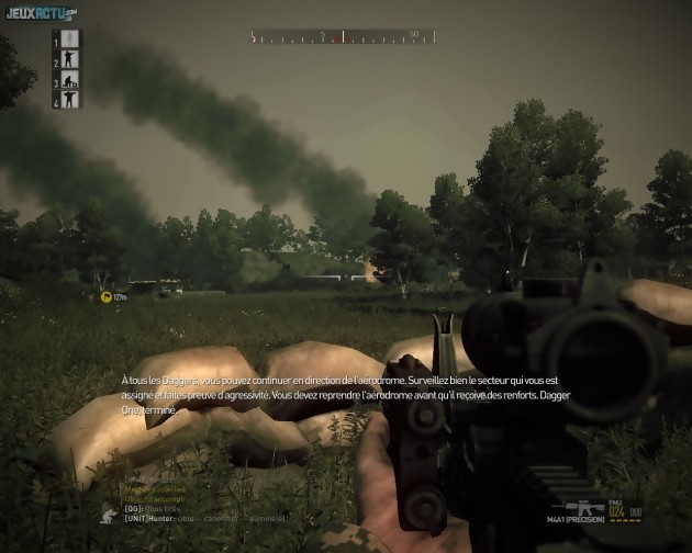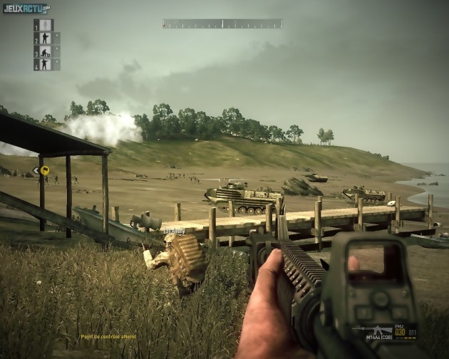 Les joueurs sont prévenus d'emblée de cet état de fait puisque les trois modes de difficulté disponibles s'intitulent "normal", "expérimenté" et "hardcore". Ce choix sémantique, qui fait l'impasse sur le classique "facile", n'est pas anodin et traduit parfaitement la réalité. En raison d'un certain réalisme (on incarne un soldat et non pas un héros), le jeu nous mène la vie dure et n'hésite pas à nous faire mourir sur le champ si l'on prend une balle en pleine tête. La gestion de la difficulté, peu commune et plutôt bien vue, ne s'opère d'ailleurs pas par un ajustement de la santé et des dégâts du joueur ou de ses adversaires, mais uniquement par des modifications de l'interface, du système de sauvegarde et de la possibilité de résurrection des alliés. En "normal", on a effectivement droit à de nombreuses aides visuelles, telles que le marquage automatique sur la boussole des ennemis repérés, ou encore l'indication en permanence, sur la boussole comme sur l'écran, de l'emplacement des objectifs et des points de rendez-vous. Ces derniers permettent à nos coéquipiers morts au combat de réapparaître comme par magie et font également office de sauvegardes automatiques. En "hardcore", rien de tout cela et le jeu se rapproche alors nettement plus d'une simulation. Du coup, il peut aussi bien convenir aux débutants (qui devront tout de même s'accrocher puisque le challenge reste en permanence élevé) qu'aux joueurs les plus élitistes. Dans tous les cas, il faut savoir planifier chaque attaque et commander intelligemment les trois coéquipiers qui nous accompagnent. Pour cela, on dispose d'une roue d'ordres rapides, dont l'agencement convient plus aux manettes qu'au clavier, mais qui permet tout de même dans les deux cas d'ordonner assez efficacement les commandes les plus basiques (suivez-moi, attaquez cette position...). Les ordres plus pointus étant perdus dans l'arborescence de ce menu contextuel, on a hélas tendance à ne pas les utiliser. Hormis peut-être les demandes de soutien aérien ou d'artillerie, qui ne sont, certes, pas disponibles en grand nombre mais s'avèrent toujours très efficaces pour nettoyer efficacement une position donnée.