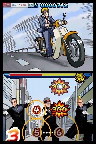 Avant d’aller sillonner la ville à grands renforts d’encouragement vocaux, il va falloir choisir son capitaine d’Oendan. Le jeu nous propose deux groupes de trois supporters différents. Le premier est mené d’une main de fer par Ippongi Ryuta, celui qui figure sur la jaquette du jeu et facilement identifiable par ses cheveux rouges en pétard. La seconde équipe est dirigée par Tanaka Hajime, crâne rasé et portant des lunettes. Si au premier coup d’œil, les deux équipes semblent identiques en tous points, elles correspondent en réalité au niveau de difficulté du jeu. "Facile" pour Hajime et "Difficile" pour Ryuta. Mieux vaut d’ailleurs commencer par Tanaka Hajime pour ne pas voir apparaître le Game Over à l’écran au bout de 20 secondes de jeu, car la difficulté de Osu! Tatakae! Oendan est savamment corsée, pour ne pas dire rebutante. Pourtant sur le papier, le principe du jeu est relativement simple : appuyer sur des pastilles numérotées dans un ordre précis et surtout en fonction du rythme et du timing demandé, à savoir au moment le cercle coïncidera avec la pastille en question, sur fond de musiques japonaises entraînantes. Si au départ, on n’arrivera sans problème à enchaîner les actions, d’autres éléments perturbateurs viendront épicer le gameplay comme ces canalisations où il faudra suivre la boule d’un bout à l’autre sans jamais lever le stylet de l’écran tactile. Il faudra faire attention à ne pas dévier de la trajectoire sous peine d’être sanctionné par une baisse de votre jauge de réussite. De temps à autres, il faudra également faire plusieurs allers-retours dans ces tubes et le cas échéant, une flèche apparaîtra subitement pour vous avertir de faire demi-tour. Pas toujours évident surtout lorsque ces canalisations affichent des formes souvent farfelues. Et oui, Osu! Tatakae! Oendan favorise le par cœur à l’instinct et c’est aussi cela qui fait son charme.