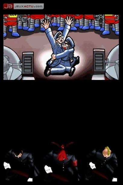 Miser sur la mémorisation par étapes des chansons est à double tranchant. D’un côté, iNiS – le studio en charge du développement – oblige le joueur à être en synchronisation parfaite avec la chanson mais d’un autre côté, empêche le joueur lambda, celui qui souhaite faire une petite partie sans se prendre la tête, de profiter pleinement du gameplay pourtant si attractif et l’ambiance joviale du jeu. Osu! Tatakae! Oendan n’hésitera pas à sanctionner nos moindres faux pas et trois erreurs suffisent pour vider la jauge de réussite qui aboutira à un Game Over irréversible. Il n’y a pas de demi-mesure ni de checkpoint dans le jeu, chaque chanson se doit être achevée d’une seule traite. Le challenge est de taille certes mais iNiS et Nintendo ont pensé à rendre accessible l’ensemble des chansons d’entrée de jeu. Ouf ! On trouve ainsi un total de 15 morceaux musicaux, tous chantés et qui prouve que la DS est capable de nous pondre des bandes sonores de qualité. Le tout est appuyé par une succession de dessins plus ou moins animés qui se découpent comme des cases de BD, dans le plus pur style des mangas japonais. Un violoniste qui lutte contre son mal de ventre pour ne pas filer aux toilettes pendant l’une de ses représentations, un élève qui tente de réviser ses examens pendant que le reste de sa famille rigole devant leur téléviseur, un citoyen qui va tenter de sauver la ville de l’attaque soudaine d’une souris bleue géante, une jeune secrétaire amoureuse de son patron en secret, un cuisinier qui doit faire face à la pénurie de clientèle, autant de situations cocasses qu’on se délecte de regarder avec un grand sourire. Osu! Tatakae! Oendan puise allégrement dans les classiques des mangas pour en faire une parodie et c’est avec un plaisir non dissimulé qu’on y adhère sans l’ombre d’une hésitation.