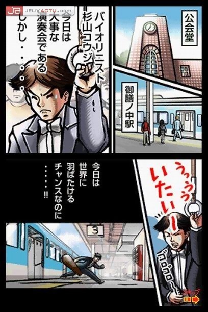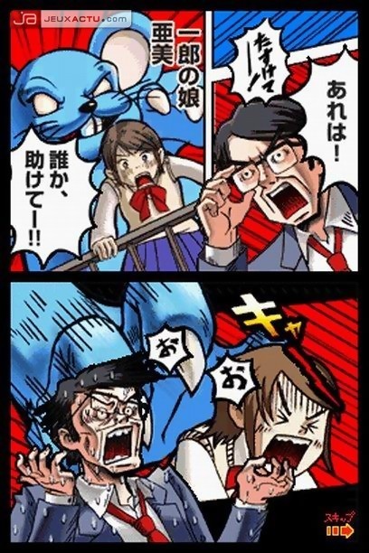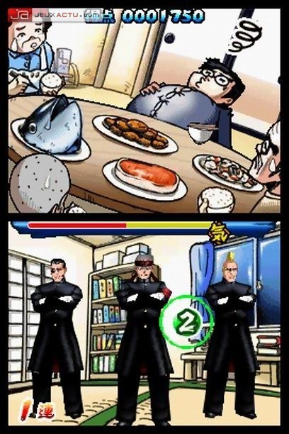 Miser sur la mémorisation par étapes des chansons est à double tranchant. D’un côté, iNiS – le studio en charge du développement – oblige le joueur à être en synchronisation parfaite avec la chanson mais d’un autre côté, empêche le joueur lambda, celui qui souhaite faire une petite partie sans se prendre la tête, de profiter pleinement du gameplay pourtant si attractif et l’ambiance joviale du jeu. Osu! Tatakae! Oendan n’hésitera pas à sanctionner nos moindres faux pas et trois erreurs suffisent pour vider la jauge de réussite qui aboutira à un Game Over irréversible. Il n’y a pas de demi-mesure ni de checkpoint dans le jeu, chaque chanson se doit être achevée d’une seule traite. Le challenge est de taille certes mais iNiS et Nintendo ont pensé à rendre accessible l’ensemble des chansons d’entrée de jeu. Ouf ! On trouve ainsi un total de 15 morceaux musicaux, tous chantés et qui prouve que la DS est capable de nous pondre des bandes sonores de qualité. Le tout est appuyé par une succession de dessins plus ou moins animés qui se découpent comme des cases de BD, dans le plus pur style des mangas japonais. Un violoniste qui lutte contre son mal de ventre pour ne pas filer aux toilettes pendant l’une de ses représentations, un élève qui tente de réviser ses examens pendant que le reste de sa famille rigole devant leur téléviseur, un citoyen qui va tenter de sauver la ville de l’attaque soudaine d’une souris bleue géante, une jeune secrétaire amoureuse de son patron en secret, un cuisinier qui doit faire face à la pénurie de clientèle, autant de situations cocasses qu’on se délecte de regarder avec un grand sourire. Osu! Tatakae! Oendan puise allégrement dans les classiques des mangas pour en faire une parodie et c’est avec un plaisir non dissimulé qu’on y adhère sans l’ombre d’une hésitation.