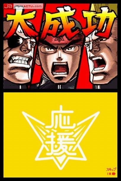 Avant d’aller sillonner la ville à grands renforts d’encouragement vocaux, il va falloir choisir son capitaine d’Oendan. Le jeu nous propose deux groupes de trois supporters différents. Le premier est mené d’une main de fer par Ippongi Ryuta, celui qui figure sur la jaquette du jeu et facilement identifiable par ses cheveux rouges en pétard. La seconde équipe est dirigée par Tanaka Hajime, crâne rasé et portant des lunettes. Si au premier coup d’œil, les deux équipes semblent identiques en tous points, elles correspondent en réalité au niveau de difficulté du jeu. "Facile" pour Hajime et "Difficile" pour Ryuta. Mieux vaut d’ailleurs commencer par Tanaka Hajime pour ne pas voir apparaître le Game Over à l’écran au bout de 20 secondes de jeu, car la difficulté de Osu! Tatakae! Oendan est savamment corsée, pour ne pas dire rebutante. Pourtant sur le papier, le principe du jeu est relativement simple : appuyer sur des pastilles numérotées dans un ordre précis et surtout en fonction du rythme et du timing demandé, à savoir au moment le cercle coïncidera avec la pastille en question, sur fond de musiques japonaises entraînantes. Si au départ, on n’arrivera sans problème à enchaîner les actions, d’autres éléments perturbateurs viendront épicer le gameplay comme ces canalisations où il faudra suivre la boule d’un bout à l’autre sans jamais lever le stylet de l’écran tactile. Il faudra faire attention à ne pas dévier de la trajectoire sous peine d’être sanctionné par une baisse de votre jauge de réussite. De temps à autres, il faudra également faire plusieurs allers-retours dans ces tubes et le cas échéant, une flèche apparaîtra subitement pour vous avertir de faire demi-tour. Pas toujours évident surtout lorsque ces canalisations affichent des formes souvent farfelues. Et oui, Osu! Tatakae! Oendan favorise le par cœur à l’instinct et c’est aussi cela qui fait son charme.