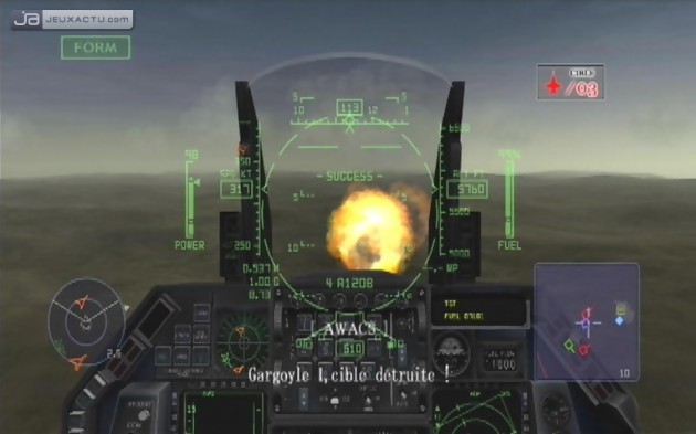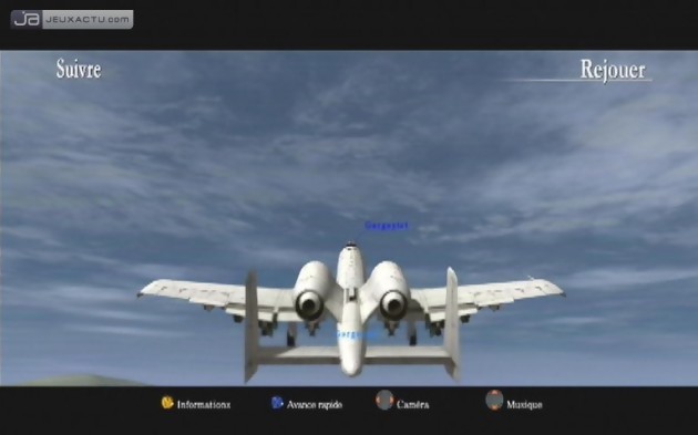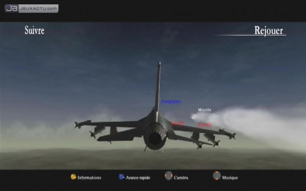 Parce que le monde connaît une crise politique sans précédent, la Energy AirForce est convoquée par l’armée américaine pour se débarrasser de menaces potentiellement terroristes. C’est un tour du monde qui attend nos 5 pilotes, prêts à embarquer dans le cockpit de guerre pour préserver la paix dans le monde. Un scénario on ne peut plus classique, simple prétexte à nous faire voyager aux quatre coins du globe. Amérique, Afrique, Asie et Europe, telles sont les terres que nous allons survoler pour profiter des paysages bien ternes de Over G Fighters. C’est en effet le premier défaut qui saute aux yeux du titre de Taito. Tristounette, la réalisation de Over G Fighters se montre surtout indigne d’une console next gen’ de la trempe de la Xbox 360. Alors que certains jeux tels que Gears of War ou Lost Planet sont autant d’arguments valables pour faire craquer le joueur qui n’a pas encore cédé à la tentation nouvelle génération, Over G Fighters fait partie de ces softs qui nous font regretter la première Xbox. Les environnements très désertiques manquent ainsi de détails et la modélisation des différentes machines de guerre du jeu (navires, véhicules terrestres) font sérieusement peine à voir. Les différents coucous proposé dans le jeu, bien qu’assez bien représentés, manquent de détails et d’effets en tout genre pour nous donner le barreau. Handicapé par une réalisation globalement morne, Over G Fighters affiche également un gameplay peu convaincant. Arcade ? Simulation ? Taito ne sait pas vraiment sur quel pied danser. Si certains éléments du gameplay (le voile noir et rouge indiquant des manœuvres dangereuses et aboutissant à l’explosion de l’appareil plus la gestion du décollage et de l’atterrissage) lorgnent du côté de la simu, d’autres aspects tels qu’une quantité quasi illimité de missiles, la facilité déconcertante avec laquelle on abat un avion ennemi et la courte durée des missions (certaines ne dépassent pas les 5 minutes de jeu) nous prouvent bien que les développeurs souhaitaient également ventiler leur gameplay. Manque de bol, le mélange ne prend pas et la sauce tourne rapidement au vinaigre. Les objectifs se montrent effectivement d’une monotonie affolante, les dogfights inexistants puisqu’on passe la plupart du temps à abattre ses ennemis à coup de missiles téléguidés. La sensation de vitesse ou d’être parmi les nuages est totalement absente et on s’amuse alors à faire des cabrioles arrières avec son engin ou foncer droit vers le sol pour espérer faire monter l’adrénaline. En vain malheureusement… Que reste-il alors à Over G Fighters ? Pas grand chose si ce n’est qu’il nous ferait presque regretter Blazing Angels, l’autre jeu d’avions récupéré par Ubisoft et qui n’était guère excitant non plus. D’oh !