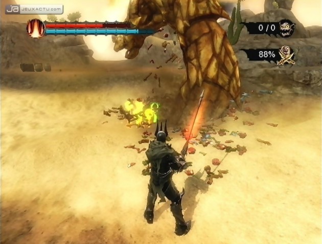 Oublions donc les promesses à la Peter Molyneux pour se focaliser sur le système plutôt bien pensé de la gestion des larbins. Vous vous doutez bien que votre stock de créatures dociles est limité, et il ne tient donc qu’à vous de l’augmenter tantôt en récupérant de la vitalité sur les ennemis tués, tantôt en ordonnant à vos bestioles de transporter certains objets jusqu’à un téléporteur. Ainsi, votre total de larbins ira crescendo, mais vous conserverez aussi une réserve importante de vitalité afin d’appeler plus tard vos amis à la rescousse en débusquant les puits de création, ce qui n’est pas un luxe notamment pour les dernières missions un peu plus pimentées. Mais avant de comprendre le comment du pourquoi, il faudra se faire la main avec vos créatures et celles-ci se dirigent au doigt et à l’œil avec, sur Xbox 360, une gestion de leur trajectoire associée au stick analogique droit. De ce fait, vous pouvez contrôler votre troupeau et le diriger dans certaines zones inaccessibles pour renflouer votre porte-monnaie ou leur dégoter des armes et armures afin d’améliorer leur défense. Pour les séquences offensives, vous pouvez directement locker les adversaires et envoyer vos larbins faire le sale boulot ; idem pour les interactions comme le transport d’items ou l’ouverture des portes. Et pour ne pas perdre vos garnements, il suffit de faire résonner une sorte de corne de brume pour les rappeler à l’ordre. Les choses se passent sans heurt malgré un système de changement de cibles un peu casse-pied et pas toujours très précis, ou une caméra difficile à diriger qui vous oblige à vous arrêter presque systématiquement pour la recadrer. Bien que vous soyez le Seigneur du Mal ou du Bien avec à votre botte jusqu’à une cinquantaine de larbins, vous n’êtes pas simplement spectateur dans Overlord. Vous pouvez également pourfendre les malotrus qui se dressent sur votre passage, ennemis comme innocents, grâce à des armes et armures que vous fabriquerez en récupérant des hauts-fourneaux et en sacrifiant quelques larbins au passage. Mais la récolte d’objets disséminés au quatre coins du pays vous permettent de découvrir de nouveaux pouvoirs magiques tels que les boules de feu, le blindage, l’altération des capacités ennemies ou la furie des larbins. Tous ont jusqu’à trois stades d’évolution pour un meilleur résultat, mais également une plus grande consommation de magie. Mais là aussi, il y a de quoi critiquer. Le système de raccourcis n’est pas des plus adéquats, notamment pour un gameplay à la manette. Les attaques de l’Overlord, au nombre de trois coups, se répètent inlassablement et sa démarche pataude a de quoi agacer à force de faire des allers-retours pour se réapprovisionner en larbins.