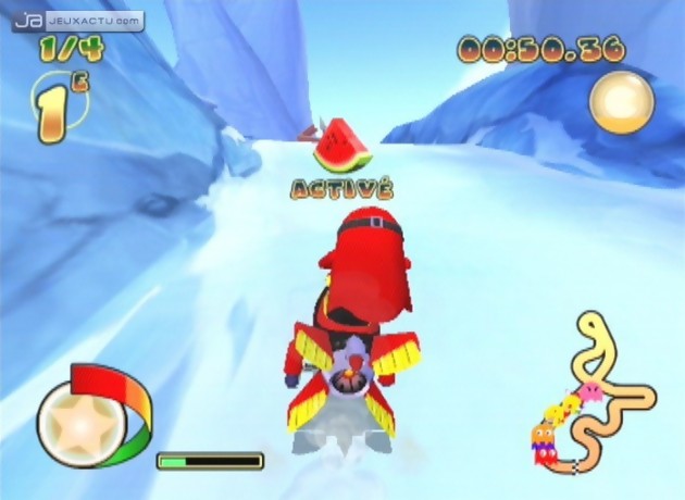 Néanmoins, il subsiste quelques idées inédites qui permettent à Pac-Man Rally d’éviter la prison ferme. Eparpillés sur la route, certains fruits (cerises, raisin ou pastèque) lorsqu’ils sont ramassés ouvrent l’accès à des passages secrets, sorte de raccourcis permettant de grignoter quelques mètres face à ses concurrents et de gagner de précieuses secondes sur le chrono final. Mais c’est bien là l’unique originalité de Pac-Man Rally, terme plutôt galvaudé quand on sait que les raccourcis dans les jeux de course existent depuis l’aube de temps. C’est donc sans surprise que l’on constate que le mode Bataille a également été repiqué de Mario Kart. Dans des arènes fermées, le but est donc d’éliminer les 7 concurrents à l’aides des bonus placés ici et là. Du déjà-vu. Mais en dehors d’un problème de personnalité, Pac-Man souffre aussi d’un manque de souplesse dans sa conduite. Et pour le coup, il aurait également fallu copier sur le maître des glissades pour obtenir un résultat aussi probant. Mais le génie n’est pas donné à n’importe qui et Namco n’a pas la carrure nécessaire pour pouvoir faire de l’ombre à Nintendo. Forcément, un sentiment de déjà-vu et de lassitude nous envahit entièrement, si bien que Pac-Man Rally restera, comme de nombreuses autres copies un énième ersatz de Mario Kart.