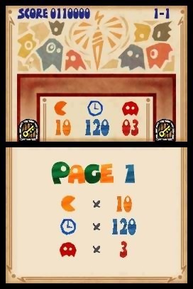 Si au début, Pac-Pix paraît d’une aisance enfantine, une fois le gameplay assimilé, la difficulté du jeu ira crescendo au fil des parties car si par malheur, il vous arrivait de voir apparaître l’écran fatidique du Game Over, il faudra alors reprendre le jeu au début du chapitre. Pas vraiment gênante au début, cette difficulté old school risque de provoquer une calvitie précoce chez les joueurs les moins patients. Ceux-là seront également confrontés à l’apparition d’une véritable stratégie pour gober tous les spectres en moins de 120 secondes. Des paramètres supplémentaires mettront votre jugeote à rude épreuve et chaque niveau a le mérite de proposer une mise en scène différente. Le jeu se découpe en plusieurs chapitres comme dans un livre. Chacun de ces chapitres est composé de 12 chapitres, eux-mêmes découpés en 5 niveaux, ce qui lui assure une durée de vie convenable. D’un point de vue technique, Pac-Pix n’est certainement pas le jeu qui poussera votre DS dans ses derniers retranchements mais possède néanmoins une belle 2D qui lui va comme un gant en velours. Le jeu s’appuie essentiellement sur son gameplay d’une originalité rafraîchissante.