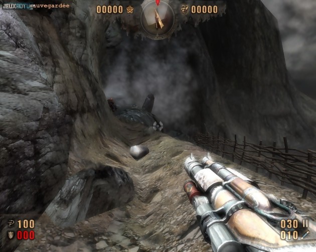 Si l'on fermera les yeux sur les apparitions magiques d'ennemis, bien pratiques pour les développeurs en manque d'imagination, on n'excusera guère leur bêtise artificielle. C'est bien simple, tous les monstres semblent obéir à une seule et unique routine de comportement : foncer droit sur le joueur. Vraiment tout droit, et en toutes cirsconstances ! Comprenez par là qu'il n'est pas rare de voir des monstres bloqués par un élément de décor placé entre eux et vous. Ils s'agglutinent alors contre l'obstacle et ne pensent même pas à le contourner. Quelquefois, les tirs de ceux placés à l'arrière viennent carrément frapper et abattre leurs collègues situés à l'avant. C'est assez rigolo à voir, surtout quand on n'a pas payé le jeu tout du moins. Ceux qui ont vidé leur porte-feuille pour se le procurer risquent de faire grise mine face à un tel spectacle. Même certains boss souffrent de ce problème, à un détail près : du fait de leur taille imposante, ils ont tendance à traverser partiellement les obstacles, ce qui ajoute encore au ridicule. Ces bugs viennent compléter une collection déjà très fournie par ailleurs. Ainsi, il arrive également au joueur de se retrouver coincé dans les décors, bien malgré lui. Dans ce cas, la seule solution consiste à recharger une partie. Le jeu prend parfois des initiatives encore plus radicales et nous balance sans ménagement sous Windows (message "Fatal Error" et autres joyeusetés). A ces soucis d'ordre technique viennent s'ajouter quelques problèmes plus conceptuels. On pense notamment à l'architecture maladroite des niveaux. Manifestement désireux d'éviter l'effet couloir, les développeurs nous ont concocté des maps sans queue ni tête, dans lesquelles on se perd parfois et qui multiplient les obstacles inopportuns. Appuyer dix fois sur la touche de saut avant de réussir à grimper sur un rocher ou voir les ennemis buter misérablement sur le moindre élément de décor un peu bas n'a franchement rien d'agréable.