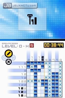 Comme tous les jeux de réflexion, Picross DS se distingue avant tout par sa simplicité et son gameplay accrocheur. Nul besoin donc d’être sorti lauréat de l’ENA pour prendre son pied, même si dans le fond Picross DS se révèle être un brin plus complexe qu’un Zoo Keeper, ActionLoop ou bien encore un Tetris par exemple. Le but dans Picross DS est pourtant on ne peut plus simple, à savoir reconstituer un dessin case par case sur une grille numérotée. Plus facile à dire qu’à faire puisqu’une fois en face de ce fameux tableau, c’est toute notre matière grise qu’il va falloir faire chauffer pour espérer compléter l’épreuve, sans trop prendre de cartons rouges. Car noircir une case ne se fait pas à la légère même si au départ, le hasard a une part d’action assez importante.