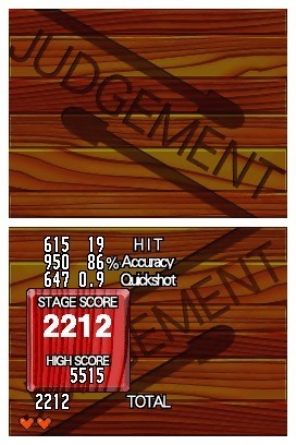 Si la série Time Crisis avait su redorer le blason des jeux de tirs aussi bien en Arcade que sur consoles de salon, Namco avait trouvé à l’époque la parade parfaite pour palier au problème de la violence et rameuter à sa cause de plus en plus de joueurs. Ce remède miracle se nommait Point Blank. Le succès étant celui que nous avons connu, plusieurs opus ont fleuri au fil des années jusqu’à ce que la série perde de son charisme avec l’arrivée du monolithe noir et de ses concurrentes. Mais Namco est fin prêt à ressusciter son titre grâce à Nintendo et son incontournable console tactile. N’imaginez pas brancher par je ne sais quel miracle un gun à la machine. Avec cette conversion le G-Con s’est transformé en stylet d'un seul coup de baguette magique. Si l’accessoire change, le concept reste le même, à savoir viser les bonnes cibles, le plus rapidement possible et en évitant les malus qui traînent sur la route. Ce changement important pour la série lui permet également de basculer dans un tout autre genre à savoir la compilation de mini-jeux.