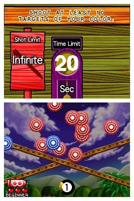 Si la série Time Crisis avait su redorer le blason des jeux de tirs aussi bien en Arcade que sur consoles de salon, Namco avait trouvé à l’époque la parade parfaite pour palier au problème de la violence et rameuter à sa cause de plus en plus de joueurs. Ce remède miracle se nommait Point Blank. Le succès étant celui que nous avons connu, plusieurs opus ont fleuri au fil des années jusqu’à ce que la série perde de son charisme avec l’arrivée du monolithe noir et de ses concurrentes. Mais Namco est fin prêt à ressusciter son titre grâce à Nintendo et son incontournable console tactile. N’imaginez pas brancher par je ne sais quel miracle un gun à la machine. Avec cette conversion le G-Con s’est transformé en stylet d'un seul coup de baguette magique. Si l’accessoire change, le concept reste le même, à savoir viser les bonnes cibles, le plus rapidement possible et en évitant les malus qui traînent sur la route. Ce changement important pour la série lui permet également de basculer dans un tout autre genre à savoir la compilation de mini-jeux.