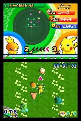 Le principe est donc on ne peut plus simple, prenez une poignée de Pokémon, dessinez une carte, placez y quelques checkpoints, et bingo, vous voilà avec un jeu tout chaud. Pour avancer, écran tactile oblige, vous devez faire glisser votre stylet dans la direction où vous souhaitez aller. Plus vous frottez vite, plus votre Pikachu va vite. Si les premières courses se déroulent uniquement sur de la route, vous devrez par la suite traverser herbe, forêt, désert, glace, marécage, mer et lave. Afin de ne pas être trop ralenti par la typographie du terrain, des "boosters" sont disposés un peu partout et vous permettent d’être à pleine vitesse quel que soit le type de terrain sur lequel vous vous trouvez. Exception faite pour l’eau, qui nécessite d’être traversé soit à dos de Lokhlass (un Pokémon aquatique pour ceux qui ne connaissent pas), soit en volant, grâce à des ballons de baudruche. Dans chaque course, le but est d’être le premier à passer par tous les checkpoints dans un ordre donné. Libre à vous ensuite de choisir le meilleur moyen, air, terre ou mer.