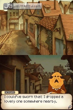 Le ton est donné dès le début, quand retrouver le chemin du village est l’occasion de découdre avec une énigme. Une autre devinette est aussi lancée pour pouvoir traverser le pont qui y mène. Côté gameplay, à la manière d’un point & clic classique, les interactions avec les habitants se font d’une simple touche du stylet. Sans grande surprise, presque tous les dialogues se solderont par des problèmes à résoudre. Pour se déplacer sur la carte du village, l’icône représentative qu’est la vielle chaussure en bas à droite de l’écran vous permet d’afficher les possibles directions qu’il faudra choisir d’un contact du stylet avec le point concerné. Le village n’est pas très grand, et il faudra à maintes reprises faire des allers-retours au gré des chapitres. A l’aide du stylet, chaque écran pourra être examinés sous toute les coutures pour trouver des énigmes cachées ou autres "hint coins", monnaie d’échange permettant au moins patients d’obtenir jusqu’à trois indices par énigmes. A chaque logique trouvée, le joueur gagnera des picarats. A chaque tentative ratée, le nombre de picarats en jeu diminue, pour s’arrêter au minimum de gain possible (sans jamais atteindre 0 pour ne pas déprimer). Au total, pas moins de 132 énigmes sont à découvrir, dont 15 en bonus. Heureusement, des chargements de console à répétition pourront être évités, car il n’est pas obligatoire de toutes les résoudre, et il sera toujours possible de se rendre dans la vieille bicoque de la vieille Ruddleton afin de rattraper les échecs. Mais à vrai dire les plus curieux mettront de l’entrain à collectionner le plus de réussites, afin de venir à bout des quelques quêtes annexes, telles que la construction d’un automate, l’assemblage de morceaux de toile former un tableau, l’acquisition d’objets par les habitants pour adapter au mieux les chambres d’hôtel des deux héros selon leurs goûts. Petite cerise sur le gâteau permettant de prolonger la durée de vie du jeu, l’éditeur optimise les possibilités offertes par la DS puisqu’il est possible de télécharger quelques énigmes supplémentaires. Dommage qu’il n’y ait pas de mode multijoueur pour donner plus de fun au genre.