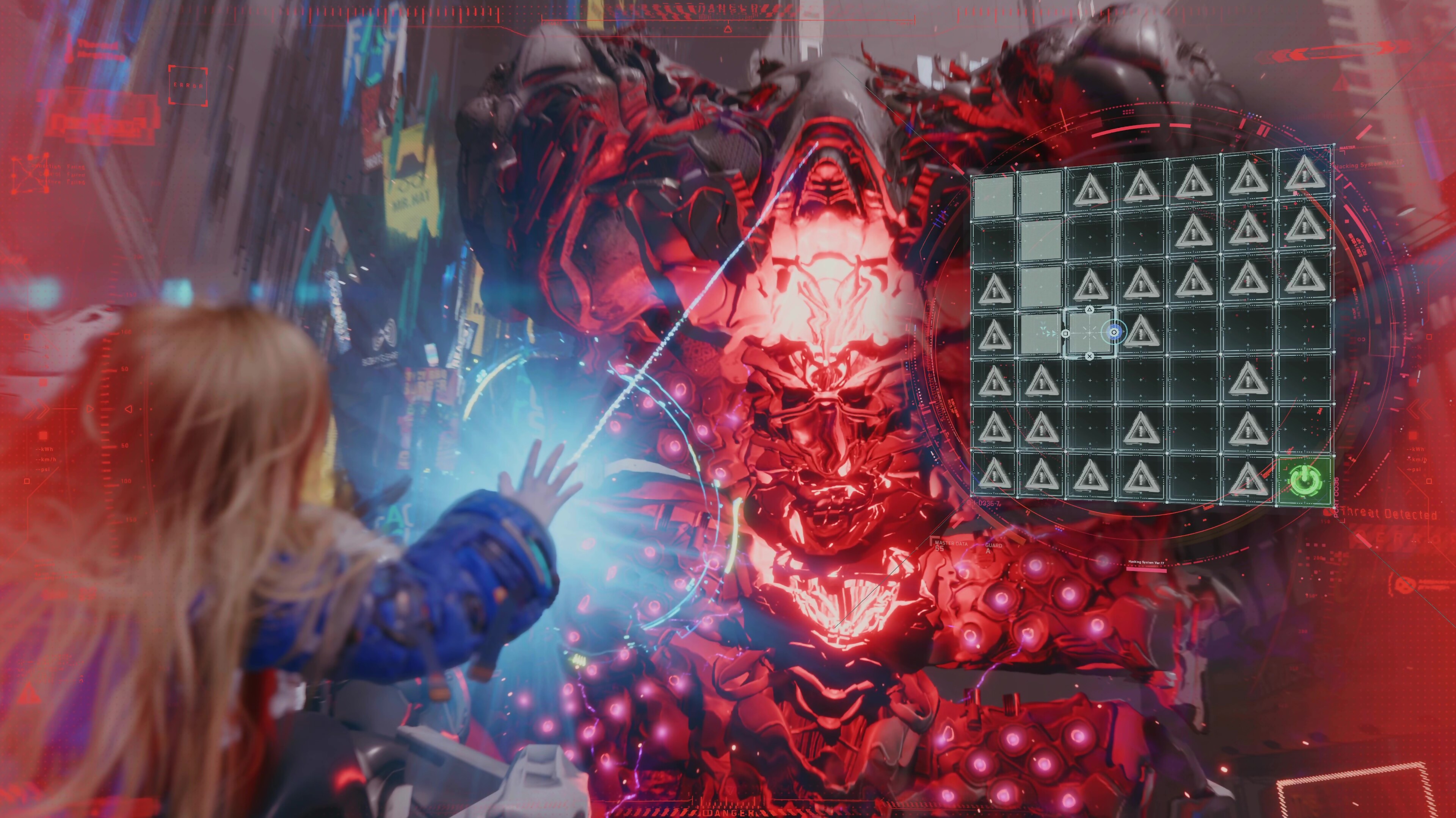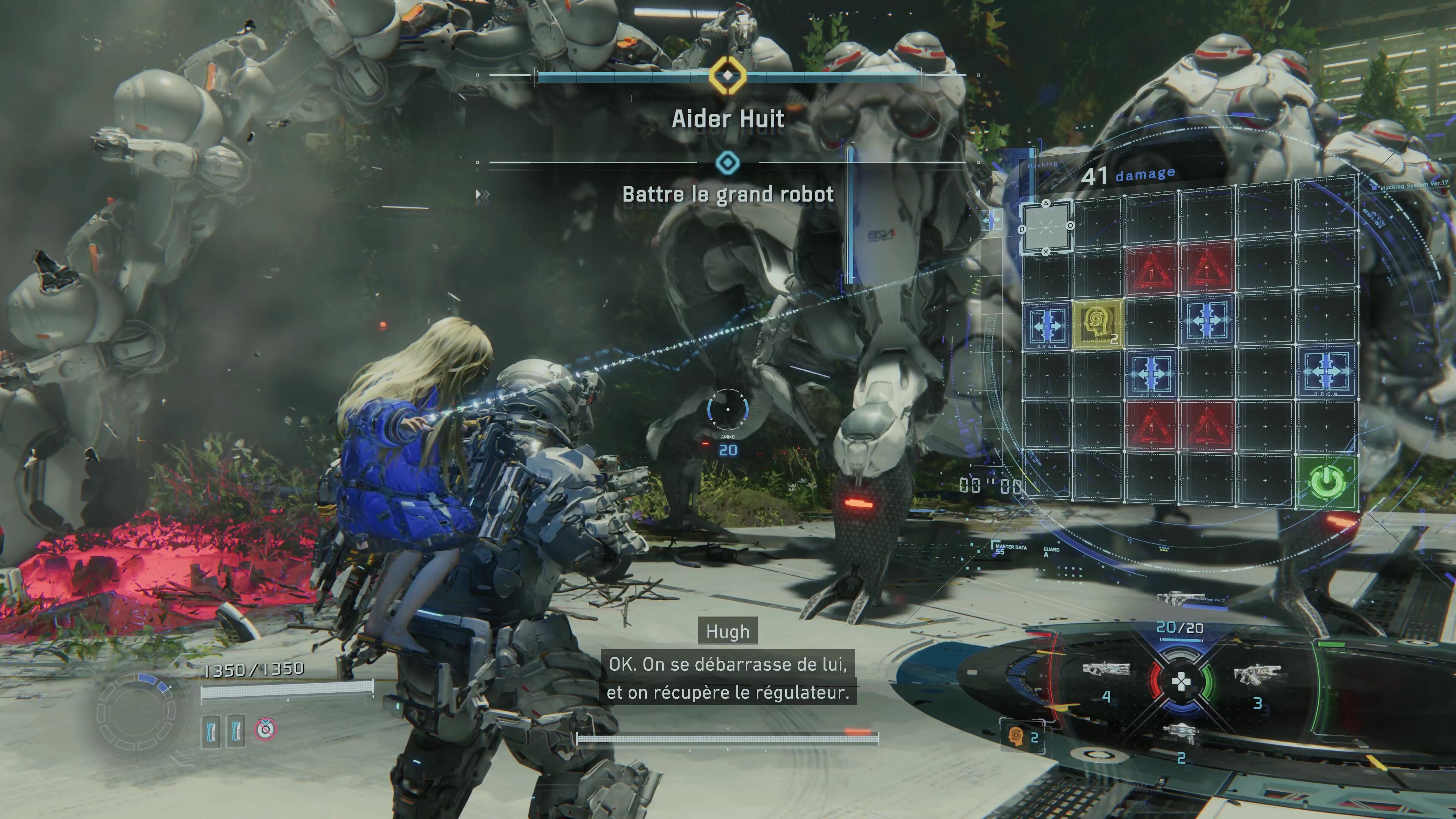 À côté de ça, Diana ne combat pas directement. Elle est systématiquement placée dans le dos de Hugh, mais son but à elle, c’est de l’aider dans ses combats. Car les tirs seuls ne suffisent pas à éliminer les ennemis mécaniques, qui sont dotés de blindage et donc résistants aux attaques classiques. C’est là que Diana entre en jeu, puisqu’elle est capable de hacker n’importe qui, à travers un système de mini-jeux en temps réel qui s’affichent pendant les affrontements. En gros, lorsque Hugh vise un ennemi, une grille apparaît à droite de l’écran : une sorte de panneau latéral qui permet à Diana d’intervenir en désactivant les systèmes défensifs adverses. Il faut alors utiliser les boutons de la manette pour naviguer rapidement dans une sorte de labyrinthe et désactiver le bouclier des robots ennemis. Parfois, il s’agit simplement de relier un point A à un point B, mais d’autres fois, des objectifs secondaires viennent compliquer la tâche. Certains chemins sont grisés et donc bloqués, d’autres sont corrompus. Il y a aussi des bonus, appelés nœuds dans le jeu, et qu’il est bien de franchir pour se donner plus de chance pour faire davantage de dégâts sur le robot qu’on est en train de hacker. On peut aussi figer l’ennemi en l’électrifiant, le faisant surchauffer ou lui dérégler ses systèmes. Concrètement, plus vous traversez de cases bleues dans la grille, plus le piratage est efficace : les dégâts infligés augmentent et l’armure ennemie reste désactivée plus longtemps.