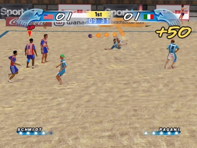 Pro Beach Soccer est donc le jeu officiel de la ligue de Beach Soccer, on y retrouve les principales équipes mondiales. Pour briser la monotonie de la vie de grand sportif qui s’offre à vous, plusieurs terrains sont disponibles avec pour chacun une ambiance propre (DJ, Babes, musique, commentateur…). Au menu des options, tout a été pensé, match amical, tournoi, entraînement… Dans ce dernier il vous sera possible de maîtriser les mouvements de bases bien entendu mais également les figures artistiques. De plus, en fonction de votre note de performance, vous pourrez débloquer de nouveaux terrains et de nouvelles équipes. Vous aurez donc avec tous les modes disponibles de quoi vous occuper un peu, que ce soit en solo ou en multijoueur. Si l’on aborde la réalisation technique, on constate que quel que soit le support elle demeure correcte, mais est néanmoins décevante dans l’ensemble. La modélisation des joueurs et l’animation sont très en deçà des références en matière de simulation sportive. La maniabilité est par contre un bon point de ce jeu, la prise en main est rapide et vous pourrez aisément faire faire des acrobaties à votre équipe. Quant à la musique, les différents morceaux qui accompagnent les matchs sont de bonne facture, dommage que les bruitages ne participent pas à l’atmosphère du jeu. Prenons l’exemple de la foule qui est digne des « ‘HO…HA…’ » préenregistrés d’une sitcom. Heureusement que de jolies danseuses polygonales et un DJ font un petit intermède durant la mi-temps pour vous détendre…