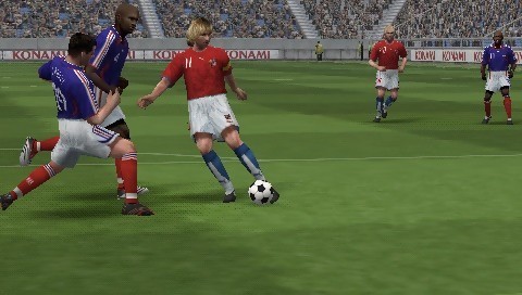 On récupère donc les plus importants modes évincés, mais également notre licence officielle Ligue 1 Orange à nous, avec ses palpitants Troyes – Nantes et ses mouvementés Auxerre – Sedan, ce qui nous évite toujours de rebaptiser nos clubs préférés. Plus besoin de renommer Bouches-du-Rhône en Olympique de Marseille. Konami continue d’ailleurs année après année sa pêche à la licence en récupérant des clubs officiels par-ci (Juventus, Bayern, Galatasaray) et des équipes nationales par-là (Trinité & Tobago, Ghana, Sénégal) mais tout en laissant fondre du biscuit acquis (qu’est-il arrivé à la Bundesliga ?). Alors PES 6 PS2 et PES 6 PSP sont-elles des versions jumelles au contenu 100% conforme ? Ce n’est pas encore le cas. La Master League, si elle consiste toujours à s’emparer d’un club et à grimper les divisions tout en étudiant les possibilités de transférer les joueurs de vos aspirations pendant les semaines de mercato, ne se veut pas aussi complète que sur console de salon. D’autres éléments, de l’ordre du détail cette-fois, sont également à la traîne comme le choix du stade. Enfin, et contrairement à FIFA 07 sur cette même machine, ne cherchez pas un mode de jeu en ligne. Si aucun gros changement n’est à relever dans la réalisation, la modélisation de la plupart des joueurs hausse le ton, avec notamment un meilleur travail sur les visages et les silhouettes. Sur le terrain, le rendu est ce qu’il est : une vingtaine de types en short qui jouent à la balle n’a rien de fondamentalement impressionnant, on soulignera donc la performance de la PSP pour mimer le visuel et la qualité d’animation de sa grande sœur de salon. Perclue de temps de chargements agaçants dans sa version 5, ce dernier opus parvient à les réduire de quelques secondes afin de rendre l’ensemble plus digeste. Les seuls chargements longs séparent désormais les différents modes de jeux, autrement ça roule. Dans la série des petites améliorations invisibles au premier coup d’œil, le retour du choix de la caméra : on peut donc enfin choisir le grand angle. Par contre, et là en tant que noob du football, je tiens à faire passer le message : l’absence d’un véritable mode Entraînement, qui se distingue pourtant cette année sur PlayStation 2, est fort regrettable. Un didacticiel qui nous ferait prendre conscience et assimiler par étapes les gestes les plus techniques du jongleur de cuir, au lieu de cette immense liste de commandes longue d’un kilomètre à faire défiler : tout simplement indigeste et anti-pédagogique. Pour une simulation de cette envergure, cette lacune reste vraiment un frein pour la bonne progression des débutants, et d’autant plus pénalisante sur une PSP comportant moins de boutons qu’un Dual Shock 2. Les commentaires du tandem infernal Jeanpierre / Arribart brillent par leur absence comme sur Pro Evolution Soccer 5, mais, petite curiosité, on les entend tout de même surgir pour scander quelques "oui, c’est au fond !" et autres métaphores lubriques, lors d’un but. Un compromis que l’on qualifiera d’original pour rester courtois. Et puis, PES reste PES, donc une simulation pointue dans laquelle on prépare avec toujours autant de plaisir un match, soit de façon totallement manuelle, soit en basant sa formation sur des mots clés prédéfinis. Séléctionnons par exemple "Offensive", "Attaque sur les côtés" et "Choisir les joueurs selon leur forme actuelle" et l’ordinateur vous proposera une configuration qui ne sera pas forcément celle de votre habitude. De quoi oser des turnover de bon aloi en toute quiétude pour ceux qui en ont marre des équipes toutes faîtes et des sélectionneurs pantouflards victimes de leurs certitudes.