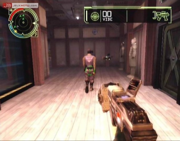 En voulant tout miser sur l’action et le fameux pacing, le jeu fait passer au second plan les différents objectifs à atteindre pour accomplir chacune des missions ; ce qui rend l’exploration des niveaux merdique, ne mâchons pas nos mots. Parfois, on a l’impression de revenir aux débuts du genre du FPS avec des sessions de bourrinage sans aucune énigme pour solliciter nos neurones. Certes, il y a des alarmes à désactiver, des ordinateurs à mettre hors tension, des guests à escorter, mais ces quelques miettes ne suffisent pas pour varier les plaisirs. Encore une fois, un peu plus de profondeur dans le scénario aurait sans doute permis d’écrire des chapitres beaucoup plus captivants. Graphiquement, le jeu s’en sort plutôt bien avec un level design de qualité, mais qui n’atteint pas des sommets comme peut s’en targuer Halo 2 pour faire plaisir à notre ami Rodolphe. Cela dit, les environnements sont vastes et tentent d’afficher des textures plutôt bien réussies. Les cinématiques, quant à elle, viennent ponctuer les moments clés du jeu. L’incontournable aliasing cher à la PlayStation 2 est plus que jamais présent, mais se fond plutôt bien dans la masse sans pour autant passer inaperçu. Une animation plus fluide et moins bancale des personnages n’aurait pas été du luxe, bien au contraire.