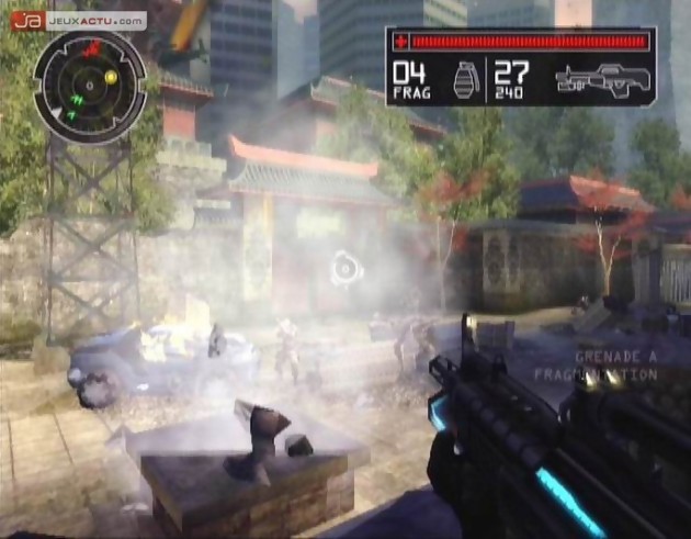 Dans une ville de Hong Kong au visage futuriste, la guerre civile fait rage. Un organisme terroriste, la République, se charge de semer la terreur dans les quartiers de la mégalopole chinoise. Nathan Frost, lieutenant dévoué qui perd la vie en voulant sauver celle de l’un de ses compatriotes, renaît de ses cendres après avoir subi quelques modifications génétiques. L’occasion donc pour le joueur d’incarner un militaire aux pouvoirs quasi illimités, et à l’artillerie bien fournie. Avec ce scénario à la sauce Robocop qui était à la mode dans les années 80, l’affaire s’engage plutôt mal. En définitive, le storyline de Project : Snowblind manque cruellement de profondeur. Aucune bifurcation ne vient ébranler cette linéarité pesante. Au fil du jeu, les personnages secondaires brillent par leur absence. Des chiens à la place des soldats, cela n’aurait fait aucune différence. Pour égayer ce tableau bien morne, le jeu offre la possibilité de prendre en main une foule d’armes dont la puissance dévastatrice permet de balayer l’écran en quelques coups de gâchette. Fusil à pompe, sniper, mitraillette, lance-roquettes, le menu est copieux. Comme c’est à la mode en ce moment, chacun de ces gadgets propose deux alternatives différentes ; il incombe donc au joueur de choisir la bonne option selon la situation dans laquelle il se trouve. Pour le lance-mines par exemple, l’utilisation première permet de lancer une mine et de la déclencher au moment voulu. Avec une pression sur R2 pour accéder à l’option secondaire de l’arme, on peut balancer des mines de proximité qui explosent lorsqu’un ennemi s’y frotte. Les nintendophiles comme moi se souviendront sans doute de Perfect Dark sur Nintendo 64, qui avait adopté le même concept. A coté de ces armes de bourrin se trouvent les inévitables amuse-gueules que sont les grenades. Inintéressantes à première vue, on se rend compte rapidement qu’elles évitent de gaspiller des munitions en voulant à tout prix claquer les adversaires les uns après les autres. Une petite grenade aveuglante et on s’esquive comme un chat ou une tarlouze, c’est au choix.