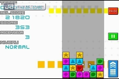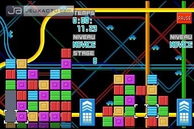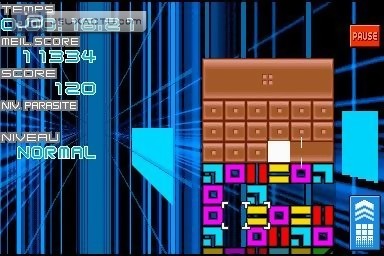 Une chose est certaine, la DS a, par son interface atypique, tous les atouts pour s’accommoder d’un jeu de réflexion, et ce Puzzle League DS nous le prouve encore. Ici, exit l’écran supérieur, il faudra tenir sa console verticalement, sûrement une manière pour garder une certaine hauteur dans la zone de jeu sans rétrécir les petits carrés à déplacer. Cependant, une configuration plus classique est disponible dans le menu des options. Le concept de Puzzle League DS est on ne peut plus simple, ici - petite originalité - les blocs ne tombent pas du ciel, ce sont des lignes complètes qui poussent votre jeu par le bas, le "Game Over" arrivant une fois un cube ayant atteint le plafond. Pour endiguer cette montée irrémédiable, il faudra à l’instar d’un grand nombre de puzzle-games, aligner au moins trois couleurs / symboles identiques horizontalement ou verticalement pour les faire disparaître ; les blocs se trouvant au dessus tomberont sous l’effet de la pesanteur. Pour arriver à ce qui constitue le cœur du gameplay de Puzzle League DS, il suffira de déplacer horizontalement (au stylet ou à l’aide de la croix et des touches) les différents blocs qui constituent votre tableau. Très simple donc, mais l’intérêt du jeu se trouvera bien vite ailleurs. On s’aperçoit au bout de quelques enchaînements qu’il faut effectuer des combos pour stopper momentanément l’ascension de notre mur. Les combos sont en fait des réactions en chaîne. Après avoir fait disparaître une série de blocs, il faut que ceux qui tombent créent eux aussi une série de trois couleurs identiques au minimum avec d’autres blocs pour disparaître à leur tour. Et c’est là que le jeu prend toute son ampleur stratégique et fera chauffer les cerveaux. Si certains combos (indiquer par une flèche) se font tout seul, le joueur aguerri tentera lui de modifier la composition de son jeu pendant que certains blocs tombent pour entraîner lui-même ces réactions en chaîne. C’est ce genre de combo qui rend le jeu si addictif et c’est non sans une certaine fierté qu’on les réalise. Au niveau des modes de jeu, Puzzle League DS se montre plutôt généreux afin d'alimenter les joueurs ayant accroché au concept. D’une grande variété, ils offrent un challenge beaucoup plus excitant que le mode de jeu classique. Autre mode assez sympathique, Au Quotidien s’adressera à ceux voulant un suivi de leur progression. A la manière d’un Brain Training, une seule séance quotidienne est autorisée, puis un graphique montrera l’évolution de votre niveau de jeu. Enfin, le jeu à plusieurs est également possible, en game sharing ou en ligne, et se montre particulièrement généreux et variés.