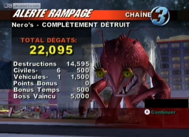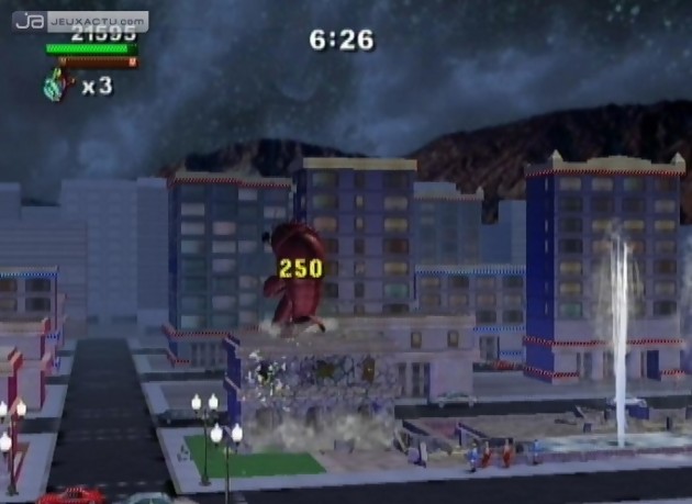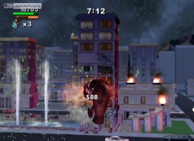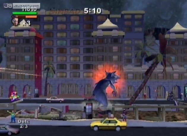 Sorti en catimini sur PlayStation 2 et GameCube, Rampage : Total Destruction signe le grand retour du trio phénomène de la série de Midway. Mais aux côtés de George le singe hystérique, Ralph le loup-garou survolté et Lizzie le lézard disproportionné, les développeurs de Pipeworks Software ont pris le soin de modéliser 29 nouveaux monstres prêts à tout pour réduire à feu et à sang Las Vegas, San Francisco, Londres, Dallas, Hong-Kong, Chicago ou encore New York. Le concept n’a pas changé d’un pouce depuis la création de la borne d’arcade dans les années 1986. Il s’agit donc de détruire les villes une à une, d’engloutir ses habitants, de résister aux forces militaires qui feront tout pour vous terrasser, de récupérer un maximum de bonus et ce sans perdre de précieuses secondes afin de décupler son high-score en fin de partie. Mais pour pimenter le Mode Campagne, les développeurs ont eu la sage décision d’intégrer quelques objectifs à atteindre afin de faire évoluer votre avatar. C’est ainsi que pour récupérer tel ou tel item, il faudra casser les immeubles les uns après les autres en s’agrippant aux fenêtres, en éclatant les vitres ou en détruisant ses fondations. Mais dans l’euphorie du saccage, il faut faire attention à ce que vous ramassez. En plus des bonus, Rampage : Total Destruction fourmille de malus néfastes à votre niveau de santé laquelle est régulièrement réduite par les tirs d’artillerie des hélicoptères ou des soldats au sol. Et lorsque les militaires ne vous mettent pas des bâtons dans les roues, c’est le décor lui-même qui peut devenir dangereux. Méfiez-vous des immeubles qui s’écroulent, des fuites de gaz ou des geysers. Autant dire que jouer à Rampage n’est pas de tout repos mais ça vous le savez déjà si vous avez déjà pratiqué par le passé un des nombreux épisodes de la série. Mais avec la Wii, il faudra mettre la main à la pâte grâce à la Wiimote. Tenue en position verticale, celle-ci permet à la fois de diriger sa créature, de balancer quelques mandales bien placées, bref de déchaîner sa furie sur de pauvres victimes innocentes. Les boutons A et B servent respectivement à taper et à sauter, c’est ensuite que vous vous occuperez de diriger la Wiimote vers le haut, le bas, la gauche ou la droite, pour orienter vos attaques. Cela aurait pu être un bon point pour Rampage : Total Destruction si seulement Gilman, Rhett, Boris et compagnie étaient maniables. Le jeu pédale dans la semoule lorsqu’il s’agit de faire avancer ou reculer son personnage en orientant la Wiimote vers le haut ou vers les bas. Notre poignet se contorsionne dans des positions impossibles pour un résultat pas toujours évident. Finalement, le gameplay est à l’image du concept même de Rampage : brouillon et répétitif. Si les fans de la série prendront un malin plaisir à réduire en poussière les cités et à redécouvrir les opus originaux de Rampage, le joueur lambda finira par se lasser au bout de quelques stages. Heureusement, l’option multijoueur et notamment le mode coopération offre un regain d’intérêt au titre. Enfin et pour terminer, Rampage : Total Destruction n’est pas le genre de jeu à exploiter à fond les capacités de la console, comme beaucoup de productions malheureusement, mais conviendra à tous avec ses graphismes colorés et bourrés d’humour malgré d’innombrables bugs de collision.
