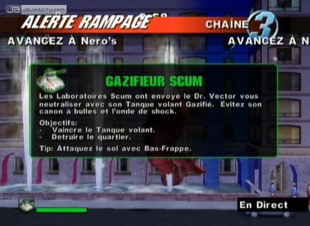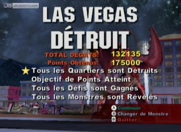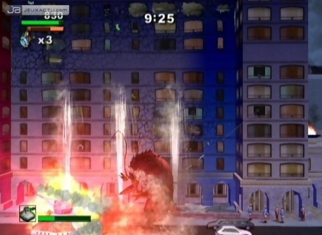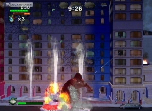 Sorti en catimini sur PlayStation 2 et GameCube, Rampage : Total Destruction signe le grand retour du trio phénomène de la série de Midway. Mais aux côtés de George le singe hystérique, Ralph le loup-garou survolté et Lizzie le lézard disproportionné, les développeurs de Pipeworks Software ont pris le soin de modéliser 29 nouveaux monstres prêts à tout pour réduire à feu et à sang Las Vegas, San Francisco, Londres, Dallas, Hong-Kong, Chicago ou encore New York. Le concept n’a pas changé d’un pouce depuis la création de la borne d’arcade dans les années 1986. Il s’agit donc de détruire les villes une à une, d’engloutir ses habitants, de résister aux forces militaires qui feront tout pour vous terrasser, de récupérer un maximum de bonus et ce sans perdre de précieuses secondes afin de décupler son high-score en fin de partie. Mais pour pimenter le Mode Campagne, les développeurs ont eu la sage décision d’intégrer quelques objectifs à atteindre afin de faire évoluer votre avatar. C’est ainsi que pour récupérer tel ou tel item, il faudra casser les immeubles les uns après les autres en s’agrippant aux fenêtres, en éclatant les vitres ou en détruisant ses fondations. Mais dans l’euphorie du saccage, il faut faire attention à ce que vous ramassez. En plus des bonus, Rampage : Total Destruction fourmille de malus néfastes à votre niveau de santé laquelle est régulièrement réduite par les tirs d’artillerie des hélicoptères ou des soldats au sol. Et lorsque les militaires ne vous mettent pas des bâtons dans les roues, c’est le décor lui-même qui peut devenir dangereux. Méfiez-vous des immeubles qui s’écroulent, des fuites de gaz ou des geysers. Autant dire que jouer à Rampage n’est pas de tout repos mais ça vous le savez déjà si vous avez déjà pratiqué par le passé un des nombreux épisodes de la série. Mais avec la Wii, il faudra mettre la main à la pâte grâce à la Wiimote. Tenue en position verticale, celle-ci permet à la fois de diriger sa créature, de balancer quelques mandales bien placées, bref de déchaîner sa furie sur de pauvres victimes innocentes. Les boutons A et B servent respectivement à taper et à sauter, c’est ensuite que vous vous occuperez de diriger la Wiimote vers le haut, le bas, la gauche ou la droite, pour orienter vos attaques. Cela aurait pu être un bon point pour Rampage : Total Destruction si seulement Gilman, Rhett, Boris et compagnie étaient maniables. Le jeu pédale dans la semoule lorsqu’il s’agit de faire avancer ou reculer son personnage en orientant la Wiimote vers le haut ou vers les bas. Notre poignet se contorsionne dans des positions impossibles pour un résultat pas toujours évident. Finalement, le gameplay est à l’image du concept même de Rampage : brouillon et répétitif. Si les fans de la série prendront un malin plaisir à réduire en poussière les cités et à redécouvrir les opus originaux de Rampage, le joueur lambda finira par se lasser au bout de quelques stages. Heureusement, l’option multijoueur et notamment le mode coopération offre un regain d’intérêt au titre. Enfin et pour terminer, Rampage : Total Destruction n’est pas le genre de jeu à exploiter à fond les capacités de la console, comme beaucoup de productions malheureusement, mais conviendra à tous avec ses graphismes colorés et bourrés d’humour malgré d’innombrables bugs de collision.
