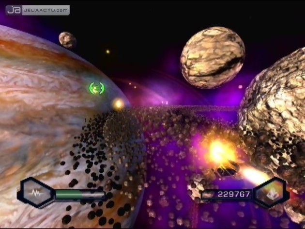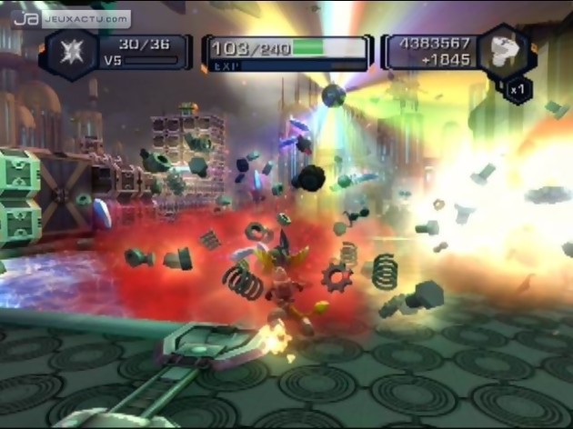 Car c'est bien dans ce domaine que la série a toujours brillé, et brille encore. On commence avec quelques armes de base, mais l'intérêt, c'est d'en acheter de nouvelles régulièrement grâce aux boulons que vous récoltez en tuant les ennemis et en détruisant pas mal d'éléments du décor. Et là, Insomniac s'est lâché. Bah oui, marre des mitrailleuses, des fusils, des guns vus, revus et archi revus ! Ici, on retourne aux sources du jeu vidéo : le fun, le délire, l'imagination. Alors préparez-vous à lancer des tornades contrôlables avec le Sixaxis, à demander de l'aide à un petit robot, à projeter des disques tranchants, à lancer des boules à facette pour faire danser vos adversaires, à les transformer en pingouin, à leur envoyer des centaines d'abeilles tueuses... Et bien sûr, en plus de tout ça, on a quand même des engins plus classiques mais qui font toujours dans la démesure avec des missiles ultra puissants, des tirs multiples etc. La plupart des armes sont même upgradables, et ce de deux façons. La première consiste simplement à les utiliser : plus on s'en sert, plus elles gagnent en expérience, franchissent des niveaux et donc gagnent en puissance. Une fois le cinquième et dernier niveau atteint, on a même droit à une petite fonction supplémentaire. La deuxième méthode est plus classique : vous pouvez dépenser le raritanium que vous amassez (comme les boulons, mais c'est beaucoup moins abondant) pour acheter diverses améliorations. Autant dire qu'au final, on dispose d'un sacré choix ! Et si on peut finir le jeu en jouant les radins et en achetant le moins possible, on a quand même tout intérêt à se faciliter la vie en agrandissant régulièrement sa collection. Si bien qu'avec une talle palette, deux joueurs n'auront pas le même équipement : à chacun de trouver les engins qui lui font plaisir et qu'il estime être le plus efficaces. Et rassurez-vous, si vous êtes du genre à vouloir tout essayer, une fois l'aventure terminée, vous pouvez recommencer en conservant tout votre matériel. Le jeu devient alors plus généreux en boulons, et vous pouvez donc acheter ce qu'il vous manquait et même découvrir encore de nouvelles armes. A noter que les boulons vous permettent aussi d'acheter des armures rendant Ratchet plus résistant aux attaques ennemies.