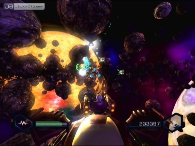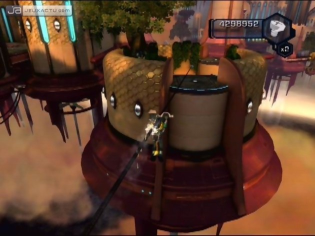 Car c'est bien dans ce domaine que la série a toujours brillé, et brille encore. On commence avec quelques armes de base, mais l'intérêt, c'est d'en acheter de nouvelles régulièrement grâce aux boulons que vous récoltez en tuant les ennemis et en détruisant pas mal d'éléments du décor. Et là, Insomniac s'est lâché. Bah oui, marre des mitrailleuses, des fusils, des guns vus, revus et archi revus ! Ici, on retourne aux sources du jeu vidéo : le fun, le délire, l'imagination. Alors préparez-vous à lancer des tornades contrôlables avec le Sixaxis, à demander de l'aide à un petit robot, à projeter des disques tranchants, à lancer des boules à facette pour faire danser vos adversaires, à les transformer en pingouin, à leur envoyer des centaines d'abeilles tueuses... Et bien sûr, en plus de tout ça, on a quand même des engins plus classiques mais qui font toujours dans la démesure avec des missiles ultra puissants, des tirs multiples etc. La plupart des armes sont même upgradables, et ce de deux façons. La première consiste simplement à les utiliser : plus on s'en sert, plus elles gagnent en expérience, franchissent des niveaux et donc gagnent en puissance. Une fois le cinquième et dernier niveau atteint, on a même droit à une petite fonction supplémentaire. La deuxième méthode est plus classique : vous pouvez dépenser le raritanium que vous amassez (comme les boulons, mais c'est beaucoup moins abondant) pour acheter diverses améliorations. Autant dire qu'au final, on dispose d'un sacré choix ! Et si on peut finir le jeu en jouant les radins et en achetant le moins possible, on a quand même tout intérêt à se faciliter la vie en agrandissant régulièrement sa collection. Si bien qu'avec une talle palette, deux joueurs n'auront pas le même équipement : à chacun de trouver les engins qui lui font plaisir et qu'il estime être le plus efficaces. Et rassurez-vous, si vous êtes du genre à vouloir tout essayer, une fois l'aventure terminée, vous pouvez recommencer en conservant tout votre matériel. Le jeu devient alors plus généreux en boulons, et vous pouvez donc acheter ce qu'il vous manquait et même découvrir encore de nouvelles armes. A noter que les boulons vous permettent aussi d'acheter des armures rendant Ratchet plus résistant aux attaques ennemies.
