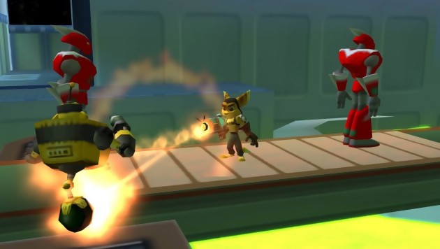 S’il est vrai que le début de le scénario flaire le déjà-vu à plein nez, l’histoire de Ratchet & Clank : La taille, ça compte réussit un contre-pied parfait au bout de quelques minutes de narration. Enfin presque, car si nos deux joyeux lurons profitent d’un peu de calme pour se dorer les fesses au soleil, leur séjour balnéaire est aussitôt interrompu par les appels en détresse d’une fillette, qui se révèle par la suite être une acolyte du méchant de service, aux intentions toujours maléfiques. Voilà comment nos deux lascars se retrouvent engrainés dans une sombre histoire qui va les emmener de planète en planète pour déjouer les plans de ce vil personnage. Ratchet & Clank : La taille, ça compte ne change pas la formule originale et le joueur se retrouvera aux commandes du tandem, lié l’un à l’autre comme les cinq doigts d’une main. Clank bien calé dans le dos de Ratchet permet à ce dernier d’acquérir quelques aptitudes intéressantes. En effet, il pourra profiter des hélices de son compagnon mécanique pour planer un court instant ou réaliser des bonds vertigineux. En plus de sa clef à molettes qui permet de fracasser la tête des ennemis alentours, Ratchet dispose d’un arsenal à faire peur un George Bush. On démarre avec un simple gun mais très vite, en glanant des boulons ici et là, il est possible de s’acheter de nouvelles armes, plus puissantes bien évidemment mais surtout aux caractéristiques différentes. A l’instar d’un RPG, plus Ratchet utilise ses outils et ses armes à feu et plus leur niveau de puissance augmentera. Mieux vaut d’ailleurs frapper un maximum d’ennemis afin de gagner en compétence et en expérience, car les Boss sont, au fil de l’aventure, de plus en plus coriaces.