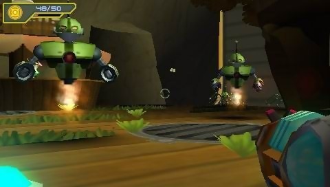Entre deux ou trois séances de défouraille pédestre, des phases en jet permettent de varier les plaisirs et d’éviter de tomber dans une lassitude certaine. Outre ces séquences de shoot'em up, il arrivera parfois de prendre le contrôle de Clank, dopé aux amphet'. Tel un Golgoth, il affrontera des robots géants sur des planètes qui paraissent alors bien petites. Difficile toutefois pour ceux qui ont déjà découvert la série sur PlayStation 2 de ne pas bailler au corneille à la vue de ce Ratchet & Clank : La taille, ça compte. Loin de nous l’idée d’affirmer que le titre est soporifique mais les ressemblances entre cet épisode PSP et les trois premiers volets sur PlayStation 2 sont telles qu’on a comme l’impression de répéter inlassablement les mêmes actions. D’autant que les niveaux et le level design ont eux aussi un air assez familier. Si le mode solo reste le principal intérêt du soft, High Impact Studio n'a pas oublié d'ajouter un mode multijoueur, jouable jusqu'à quatre personnes et reprenant le concept des derniers épisodes sur PS2. Malheureusement, soit par manque de temps, soit par manque de place sur l'UMD, ce mode multijoueur se montre assez limité avec des combats en Deathmatch assez répétitifs sur la longueur. Autre bémol également qui concerne la caméra, pas toujours très adaptée à certaines situations, et qui a tendance à rester coller à l'écran par moments. Cela dit, pour un jeu développé sur PSP, Ratchet & Clank : La taille, ça compte parvient à surprendre du côté de sa réalisation. Propres et soignés, les graphismes du jeu nous démontrent une fois encore que la nomade de Sony est loin de faire figuration lorsqu’il s’agit d’en mettre plein les mirettes. Certes, les textures ont perdu en détails et la profondeur de champ n’est plus aussi impressionnante que sur PS2, mais l’ensemble reste suffisamment réussi pour s’émerveiller à certains moments. Encore faut-il maintenant faire partie de la catégorie de ceux qui découvrent la série pour la première fois…