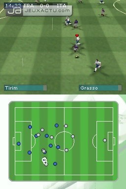 Balle au pied, Real Football 2008 peine à convaincre, la faute à un gameplay à la rue. Que l'on évolue en 4-4-2, en 4-3-3 ou bien encore en 3-5-2, le placement des joueurs demeure approximatif, ce qui ne permet pas de pratiquer un football séduisant. Il n'y a qu'à regarder les défenseurs qui ne proposent aucune solution de relance à leur gardien de but, ou les milieux de terrain qui ne couvrent pas leurs latéraux dans les actions offensives, pour s'apercevoir que le positionnement est un mot banni du vocabulaire ici. Cerise sur le gâteau : le portier qui reste constamment planté sur sa ligne de but comme dans un bon vieux Virtua Striker. Chapeau l'artiste. Contrairement à PES, on ne peut pas exécuter des centres à mi-hauteur ou des frappes à ras de terre en tapotant brièvement A ou Y. En phase défensive, presser l'adversaire en maintenant B est la meilleure solution pour lui chiper le cuir, car les tacles sont loin de faire dans la précision. Et même en s'appliquant à jouer le ballon, l'arbitre n'hésite pas à mettre le sifflet à la bouche. On peut d'ailleurs essayer de l'impressionner en postillonnant sur le micro, mais la tentative est généralement vaine. Le double-écran de la DS, quant à lui, n'offre pas un confort visuel optimal. En effet, on aurait préféré que le radar se situe juste en-dessous du terrain, au lieu de figurer sur l'écran du bas, pour éviter de perdre la balle de vue. En termes de réalisation, Real Football 2008 se contente d'un rendu graphique proche d'un Pro Evolution Soccer sur PSOne. Des genoux et des coudes carrés donc, et des gros plans sur le visage des joueurs inexistants. Cela dit, les développeurs ont plus ou moins essayé de rester fidèles aux stades originaux, même si quelques-uns ne sont pas reconnaissables dès le premier coup d'oeil. Au niveau des modes de jeu, Real Football 2008 propose du classique : Match Amical, Multijoueur, Entraînement et Paramètres. Il y a aussi une rubrique Modes de Jeu dans laquelle sont regroupées différentes compétitions - Coupe, Championnat, Europe 2008 - mais aussi un mode Penalty - à gérer entièrement au stylet - et la galerie des Trophées. Ces gourmandises permettent au titre d'atteindre une durée de vie honorable. Enfin, on évoquera les équipes - clubs et sélections - présentes dans la cartouche. Ne bénéficiant d'aucune licence officielle, Real Football 2008 est contraint de défigurer les noms des joueurs. On a ainsi droit à Ribario au lieu de Ribery, Pirli à la place de Pirlo, ou bien encore Close à la place de Klose. A l'ancienne.
