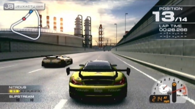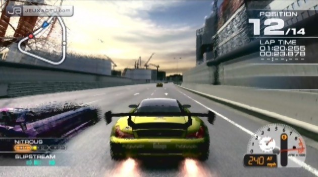 Comme évoqué un peu plus haut, il est possible d'activer les capteurs du Sisaxis. C'est un coup de main à prendre : presser et relâcher au bon moment Croix tout en faisant des grands gauche-droite pour réaliser des drifts impecc'. A l'instar de certains titres Wii tels que Red Steel pour ne citer que lui, la reconnaissance de mouvements est défaillante, avec un certain temps de latence entre chaque coup de poignet. Un delay ignoble qui vient s'ajouter au peu de classe que l'on a à tenir la manette comme ceux qui jouent pour la première fois à un jeu de course. Compatible 1080p pour les plus fortunés, Ridge Racer 7 se dote d'une réalisation toute juste correcte, mais pas suffisante pour un jeu sorti il y a un peu plus d'un an sur une console next-gen. Si les bolides paraissent plus détaillés et plus reluisants que sur Xbox 360, les environnements pêchent toujours pas leur manque de textures et d'éléments décoratifs. L'impression de vitesse est par contre excellente, et on se régale en nocturne avec ces traînées lumineuses omniprésentes. En offline, on a droit à un écran splité qui dégrade légèrement la qualité visuelle du jeu. Par moments, le framerate se met même à tousser, mais rien de bien grave.