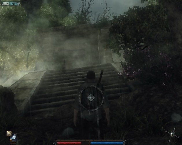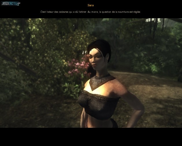 Le héros de Risen commence son aventure en tant que passager clandestin d'un navire bien mal en point, puisqu'en proie à une violente tempête et placé face à un monstre gigantesque. Une scène cinématique et un naufrage plus tard, notre homme régresse carrément au statut de rescapé, avec uniquement des haillons en guise d'armure et une branche ramassée à terre pour se défendre des animaux sauvages alentours. L'île sur laquelle il a échoué n'est donc pas des plus accueillantes, même si elle constitue un paysage très agréable du point de vue du joueur. Car à l'instar des Gothic, et contrairement aux Morrowind et autres Oblivion, les décors ne sont pas générés aléatoirement mais amoureusement placés "à la main". Conséquence immédiate de cette façon de faire : le terrain ne s'étend pas inutilement sur des centaines d'hectares, chaque lieu paraît crédible, des surprises nous attendent au détour de chaque chemin et, en conséquence, les balades à pied constituent un plaisir sans cesse renouvelé. Sans être forcément à la pointe de la technologie, le moteur graphique gère tout de même très correctement les effets de profondeur de champ, de haute luminosité, de végétation touffue, de météo... L'ensemble s'avère plus qu'agréable pour les yeux même si, hélas, on ne peut pas vraiment en dire autant en ce qui concerne les personnages. Si les ogres et les guerriers barbus s'en tirent encore sans trop de dommages, les créatures féminines sont tout simplement ratées. Avec leurs corps anguleux et leurs visages inexpressifs, nous sommes très loin du potentiel de séduction des poupées manga des jeux de rôle japonais, ou des guerrières aguicheuses des MMO occidentaux. Les développeurs de Piranha Bytes souffriraient-ils de misogynie ? Dans ce cas, ils auraient été bien inspirés de ne pas choisir une donzelle nommée Sara comme première rencontre humaine sur l'île. Son physique bancal pourrait, à tort, faire mauvaise impression auprès des joueurs. Mais fi de ces considérations esthétiques ! L'intérêt et la force du jeu se situent vraiment plus sur le fond que sur la forme.