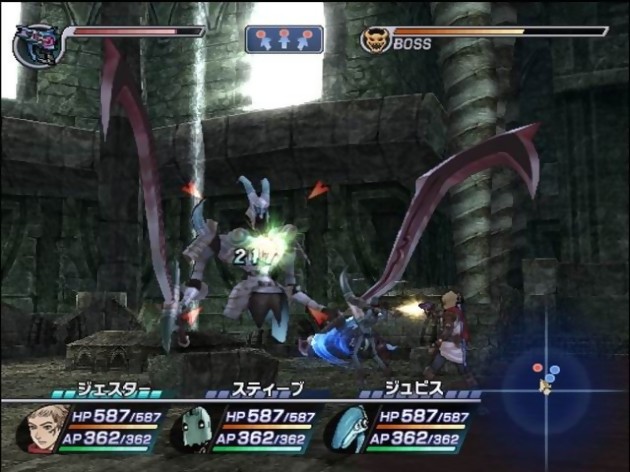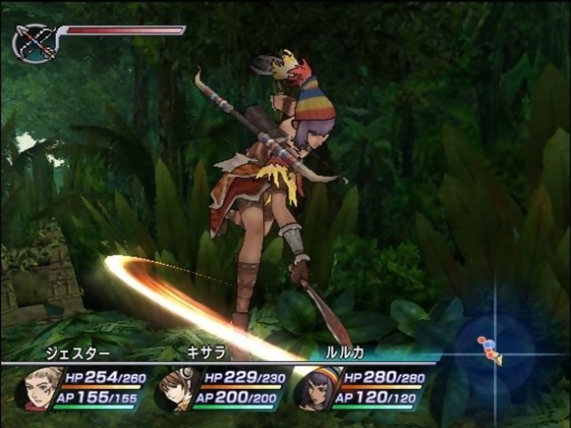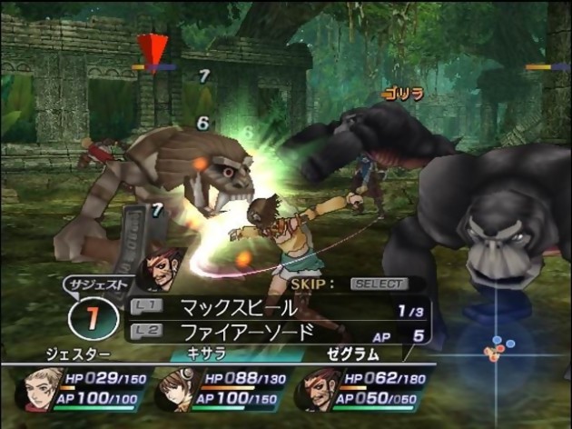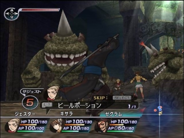 Gros chapitre de tout bon RPG, les combats de Rogue Galaxy tirent d'entrée la production de Sony vers le haut. Imaginez d'abord des déplacements et des actions totalement libres, comme dans un Star Ocean. Ici, le parallèle avec Final Fantasy XII s'éloigne. Ne cherchez pas une main mise sur l'I.A. alliée façon Gambit System, toute customisation abyssale (voire superflue) n'a pas sa place dans ce RPG qui compense avec un ingénieux système de suggestions. Le joueur ne maniant forcément qu'un seul individu à la fois (possibilité de switcher) l'interaction avec ses compatriotes ne se joue que sur très peu de détails, mais ces derniers vont, en fonction de la situation, vous proposer spontanément des solutions qu'il vous suffit de confirmer ou d'infirmer avec les gâchettes. Est-il utile d'utiliser une potion de soin comme le suggère Kisala , ou bien vaut-il mieux en finir tout de suite avec un bon coup spécial comme l'encourage Steve ? Libre à vous de décider. Si l'on peut regretter de ne pas vraiment avoir une influence sur les tendances des suggestions, ce principe ingénieux permet aux personnages commandés par le CPU de jouir d'un certain libre arbitre. Ni trop simplet, ni trop profond, ce petit détail tend à rendre l'équilibre et le rythme de jeu incroyablement bien balancés. Ajoutez à cela une capacité de mouvement très variée : le personnage saute, peut parer une attaque, ou encore choper les adversaires. Sommes nous dans un beat'em all ? Non, une petite restriction anti-bourrin a tout de même été pensée avec la jauge d'action qui, une fois vide, oblige à reprendre son souffle. Mais ce n'est que pour peu de temps, sans oublier que parer un coup avec succès aura pour effet de la remplir fissa ! Aviez-vous déjà vu un RPG dans lequel il faut d'abord sauter sur un ennemi pour pouvoir dévoiler son point faible ? Ce pur RPG qu'est Rogue Galaxy se fait donc hybride avec un Action RPG façon Kingdom Hearts. Si en plus je vous parle de la jauge spéciale qui, lorsqu'elle est pleine, permet de déclencher une sortie de furie basé sur une série de boutons à valider en rythme, nous parviendrons facilement à la même conclusion : le dynamisme est le maître mot des combats de Rogue Galaxy, terme qu'il était  plutôt difficile d'employer à propos d'un Final Fantasy XII aux relents offensifs passifs. Et comme pour mettre toutes les chances de son côté, Rogue Galaxy surprend sur de petits détails ergonomiques comme l'utilisation instantanée d'un objet. Le combat est interrompu par l'ouverture du menu, et l'utilisation d'une bonne potion de soin ou de résurrection est immédiate, tant que la jauge d'action permet de piocher l'objet ! L'absence de la stratégie propre au tour par tour provoque t-elle une répétition de l'action ? A vrai dire, Rogue Galaxy n'est pas davantage répétitif, que  n'importe quel autre RPG, mais la fréquence des combats est assurément conséquente, et son level design prévu pour que le joueur ait le temps de faire un bon paquet de rencontres. Par ailleurs, il s'agit d'une alchimie globale : le fait de constamment imbriquer des nouveaux objets dans les tableaux de Révélations donne  la sensation d'évoluer constamment. On ne se prend également pas la tête au niveau de l'équipement, avec simplement deux armes par personnages (courte et longue distance) à renouveler régulièrement pour évoluer en cohérence avec son level.