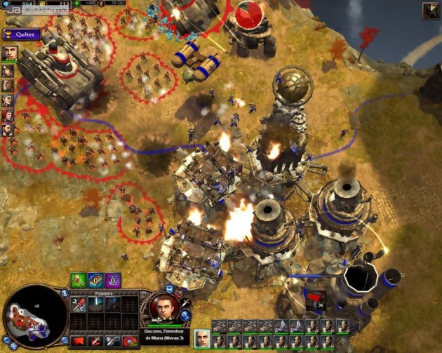 Trois nations, trois technologies mais une seule et même histoire, celle de Giacomo, un des héros récurrent de l’aventure cherchant désespérément à venger la mort de son frère assassiné par le Doge. Traversant trois régions chacune peuplée d’une civilisation alliée bien spécifique, vous allez très vite devoir apprendre à maîtriser les forces de chacune pour parvenir à vos fins et, autant le dire de suite, la route sera longue avant d’obtenir justice. Des Vinci s’appuyant sur la technologie à vapeur et tirant leur nom du génie spécialement à la mode en ce moment aux Cuotl mélangeant dieux incas et énergie extra-terrestre, en passant par les Alin, ermites du désert et spécialistes de la magie, les unités changeront d’un peuple à l’autre et vos méthodes d’approche aussi par la même occasion. Si le nombre d’unités par race nous laisse alors un peu sur notre faim, les différences entre elles compensent heureusement largement ce manque par une diversité évidente et il faudra apprendre à bien utiliser ses ressources sur la carte tactique pour développer sa stratégie. Les joueurs de Rise of Nations navigueront alors en terrain connu et, pour les nouveaux découvrant la série, rassurons les en précisant que l’interface et les aides contextuelles sont assez claires pour ne pas s’y perdre et c’est d’ailleurs là l’un des points fort du jeu. Complet dans ses nombreuses possibilités, Rise of Legends n’en reste en effet pas moins accessible et mêmes les débutants de la stratégie prendront leur pied en quelques minutes seulement. Attribuer ses points entre deux batailles devient alors d’une simplicité enfantine et seuls vos choix stratégiques pourront faire surchauffer les méninges.