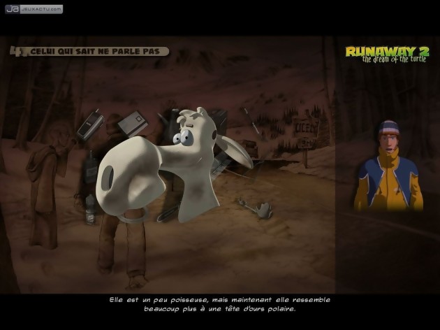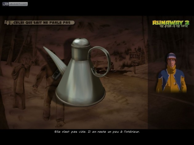 Il n'y a plus une minute à perdre, il va maintenant falloir jouer du mulot comme personne pour visiter les lieux, récupérer un maximum d'objets, dialoguer avec les différents personnages. C'est à l'aide du curseur que vous allez guider Brian. Le clic gauche indiquant une direction ou un item à regarder, le clic droit permettant de réaliser une action (prendre ou utiliser). En terme de gameplay, on notera l'arrivée d'une nouvelle fonctionnalité offrant la possibilité de rallier un point à un autre grâce à un double clic. Cette option est très appréciable surtout lorsqu'il s'agit de retourner sur un lieu déjà visité pour récupérer un objet. Et des objets, vous allez en ramasser à la pelle, même si de prime à bord, certains d'entre eux vous sembleront complètement inutiles. Sachez qu'ils auront tous un intérêt à un moment ou à un autre. Bien entendu, certains objets ne seront pas toujours utilisés dans leurs fonctions initiales. Par exemple dans le chapitre 1, vous serez amené à ramasser des raquettes de randonnée qui vous permettront d'équilibrer le poids de Brian pour passer un pont en ruine. Tous les objets ramassés sont entassés dans un inventaire. Vous pourrez les utiliser quand bon vous semble, mais si Brian trouve votre idée complètement farfelue il n'hésitera pas à vous le faire remarquer et parfois de manière assez ironique. L'inventaire se trouve en haut de votre écran tout comme le menu principal. Pour les trouver, il suffit de passer le curseur sur le haut de l'image qui bascule soudainement en 16/9 pour proposer les menus. La navigation est fluide et se déroule sans encombre. Une fois dans l'inventaire, il est possible de faire interagir deux objets entres eux pour mener à bien une action. Du côté du menu, on trouve de nombreuses options audio et vidéo (réglage de la qualité des vidéos, activation des sous-titre, luminosité…) mais aussi un rappel en images du premier épisode. Même si avoir joué à Runaway : A Road Adventure n'est pas obligatoire pour jouer à sa suite. L'intention reste bonne.