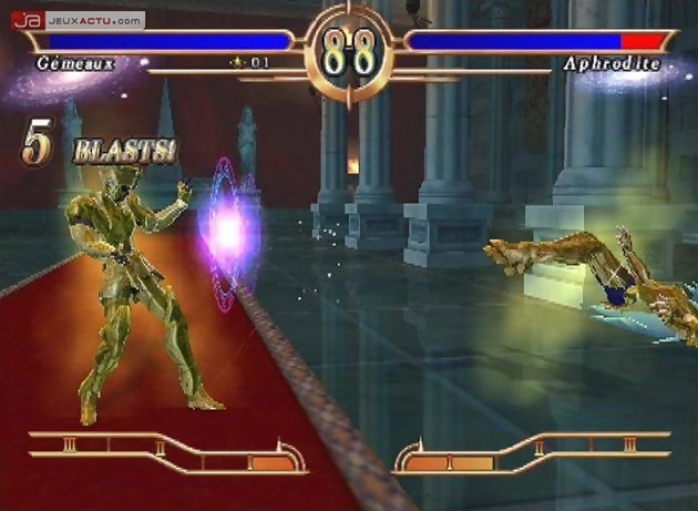 Saint Seiya, Les Chevaliers du Zodiaque : Le SanctuaireEn cas de mort prématuré face à l’un de vos opposants, l’esprit d’Athéna vous donnera une seconde chance, à condition de pouvoir relever son héros. Pour ce faire, là encore, il va falloir tapoter sur sa manette comme un forcené. Attention quand même à ne pas trop perdre souvent, sous peine de rester cloué au sol. Entre chaque maison d’un Gold Saint, le jeu changera de point de vue, en se transformant subitement à un beat’em all des plus catastrophiques. C’est laid, injouable et d’une utilité frisant le degré de l’ultime attaque de Camus, Chevalier du Verseau. Clou du spectacle, alors qu’on s’attend à dézinguer la totalité des ennemis qui arrivent par dizaine, on passe au niveau supérieur en plein combat, sans jamais comprendre pourquoi. Un passage bien chaotique qui démontre à quel point Dimps est capable du meilleur comme du pire. Peut-on alors se consoler en écoutant les musiques de Seiji Yokoyama ? Que chi ! Atari n’a même pas eu les droits de diffuser les magnifiques thèmes de la série qui réussit à elle seule à relever la qualité du jeu, du moins dans sa mouture japonaise. Pour la version PAL, il va falloir se contenter de pâles copies, à la saveur inexistante et qui ne bénéficie d’aucun peps. Un comble !