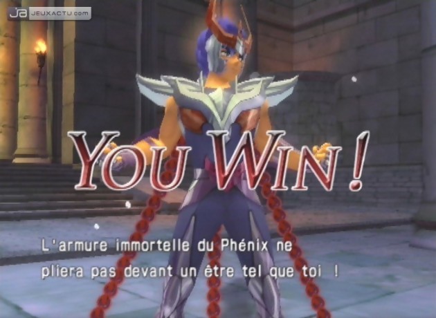 Cette vérité enfin établie, il est donc plus aisé de comprendre pourquoi les évolutions graphiques entre Saint Seiya, Les Chevaliers du Zodiaque : Le Sanctuaire et Saint Seiya, Les Chevaliers du Zodiaque : Hades sont inexistantes. Le moteur 3D n’a pas changé d’un iota, les personnages sont toujours aussi mal représentés – Shun et Sion en tête de liste – et l’animation toujours aussi mécanique. Pour trouver un véritable changement dans ce nouvel épisode, il faut se tourner du côté du gameplay, bien plus intéressant et efficace pour l’amateur de combats cosmo-galactiques. Les bases restent sensiblement les mêmes mais Dimps a su écouter et lire attentivement la longue liste de défauts énumérés par les fans et les critiques pour améliorer son produit. Tout d’abord, on se rend compte que nos Chevaliers se déplacent plus vite, beaucoup plus vite même. C’est comme si on avait injecté un moteur V6 à une 2CV. Le résultat à l’écran saute immédiatement aux yeux et on peut enfin parler d’un quelconque système de combat. Le dash fait d’ailleurs partie de ces nouveautés qui permettent de se déplacer plus rapidement. Une astuce qui fonctionne aussi bien vers l’avant pour surprendre son adversaire que vers l’arrière pour fuir le combat. Mais ce n’est pas tout, désormais il est aussi possible d’esquiver les attaques de son adversaire en faisant pivoter son personnage sur les côtés, un peu de la même manière que Soul Calibur. Quelques pas sur les côtés au moment où son opposant balance une vague d’énergie et le voilà à la merci de vos coups. C’est assez efficace, surtout quand il est possible d’ajouter un dash supplémentaire pour pivoter autour de lui à une vitesse accrue. Assez grisant.