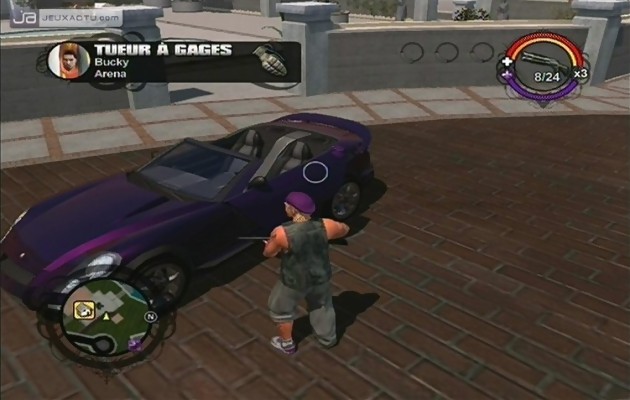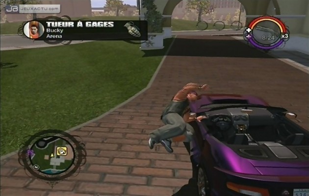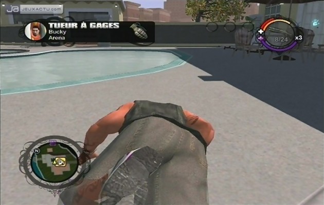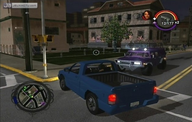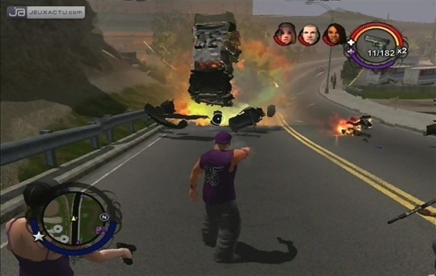 Bien entendu, ce genre d’accident a une incidence sur votre jauge de santé qui en prendra un coup au passage. Je ne vous dirais pas de conduire prudemment surtout lorsque vous avez les condés aux fesses. Ne vous inquiétez pas, il existe plusieurs moyens de régénérer votre niveau. La première est d’attendre sagement que votre vie remonte, ce qui facilite un peu trop les missions et les situations à risque. La deuxième est de se remplir les poches de fast-foods que vous utiliserez en appuyant sur B. Et la troisième est d’utiliser votre téléphone portable afin d’appeler le 911 pour qu’une ambulance viennent directement vous soigner. Mais dans Saints Row, on soigne le mal par le mal ! Autrement dit rien ne vaut une bonne décharge de chevrotine pour calmer les ardeurs de certaines racailles. Tout comme Grand Theft Auto, on y revient, il existe plusieurs types d’armes que vous pouvez acheter, trouver sur les cadavres ou débloquer dans votre planque. Vous commencerez les bastons à mains nues. Quelques coups de tatanes suffiront à mettre votre assaillant à terre mais bien sûr cette technique est plutôt longue et risquée lorsque ce dernier sort de son chapeau une arme.