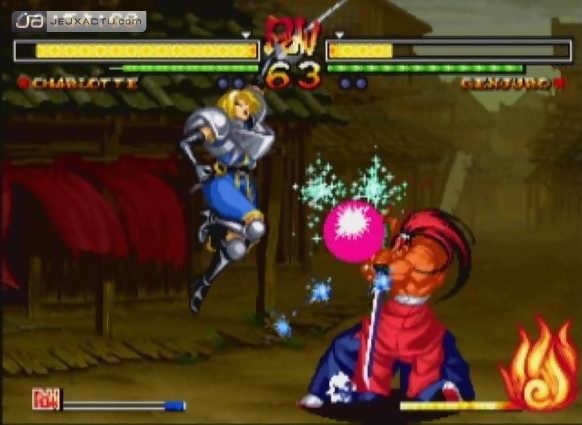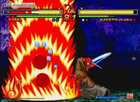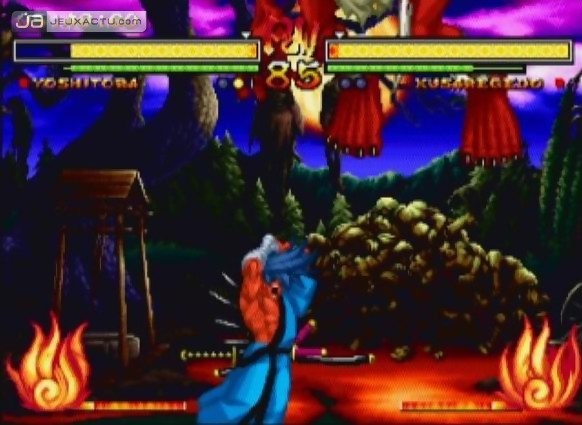 La déception est également palpable du côté du casting. Il est certes conséquent pour un jeu estampillé Samurai Shodown mais parmi ces 26 épéistes, bon nombre d’entre eux ne méritent pas leur place. On pense naturellement à Rasetsumaru, alter égo maléfique de Haohmaru et disposant à peu près de la même panoplie d’attaques que son antagoniste. Idem pour Yumeiji Kurokochi et Sankuro Yorozu, clones respectifs (aussi bien dans le design que dans les coups) de Ukyo Tachibana et Genjuro Kibagami. Les personnages doubles ne s’arrêtent d’ailleurs pas là puisque SNK Playmore a eu l’idée d’intégrer Suija et Enja les âmes perdues des frères Kazama. Reste heureusement Yoshitora Tokugawa, Mina Majikina, Yun Fei et Kusaregedo, les 5 personnages plus ou moins intéressants de cette édition qui n’arriveront néanmoins pas à faire oublier la redondance d’une distribution mal choisie. Il y a donc clairement un manque d’idées apparentes et cette frustration se fait également sentir au niveau du gameplay qui a perdu de sa superbe. Difficile aussi de passer après un Samurai Spirits IV : Amakusa's Revenge qui avait placé la barre très haut il faut l'avouer, et reste pour beaucoup, l’épisode le plus abouti de la série. La barre de rage en bas d’écran est toujours présente et à l’instar des anciens opus, elle permet de réaliser les furies une fois à son paroxysme mais surtout d’infliger des coups plus puissants. Il est d’ailleurs toujours possible de faire exploser la jauge de rage à tout moment en appuyant sur les trois touches correspondantes simultanément ou par le bouton raccourci R2. Le personnage rentre alors dans un état de trans où toutes ses capacités offensives sont au maximum.