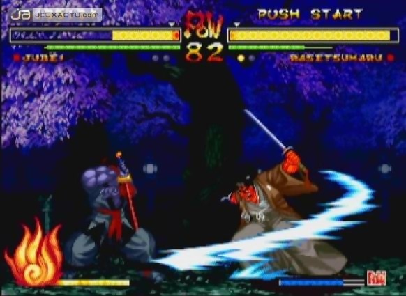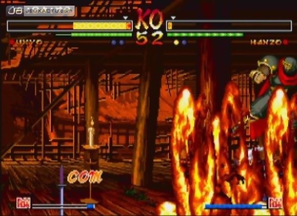 La déception est également palpable du côté du casting. Il est certes conséquent pour un jeu estampillé Samurai Shodown mais parmi ces 26 épéistes, bon nombre d’entre eux ne méritent pas leur place. On pense naturellement à Rasetsumaru, alter égo maléfique de Haohmaru et disposant à peu près de la même panoplie d’attaques que son antagoniste. Idem pour Yumeiji Kurokochi et Sankuro Yorozu, clones respectifs (aussi bien dans le design que dans les coups) de Ukyo Tachibana et Genjuro Kibagami. Les personnages doubles ne s’arrêtent d’ailleurs pas là puisque SNK Playmore a eu l’idée d’intégrer Suija et Enja les âmes perdues des frères Kazama. Reste heureusement Yoshitora Tokugawa, Mina Majikina, Yun Fei et Kusaregedo, les 5 personnages plus ou moins intéressants de cette édition qui n’arriveront néanmoins pas à faire oublier la redondance d’une distribution mal choisie. Il y a donc clairement un manque d’idées apparentes et cette frustration se fait également sentir au niveau du gameplay qui a perdu de sa superbe. Difficile aussi de passer après un Samurai Spirits IV : Amakusa's Revenge qui avait placé la barre très haut il faut l'avouer, et reste pour beaucoup, l’épisode le plus abouti de la série. La barre de rage en bas d’écran est toujours présente et à l’instar des anciens opus, elle permet de réaliser les furies une fois à son paroxysme mais surtout d’infliger des coups plus puissants. Il est d’ailleurs toujours possible de faire exploser la jauge de rage à tout moment en appuyant sur les trois touches correspondantes simultanément ou par le bouton raccourci R2. Le personnage rentre alors dans un état de trans où toutes ses capacités offensives sont au maximum.