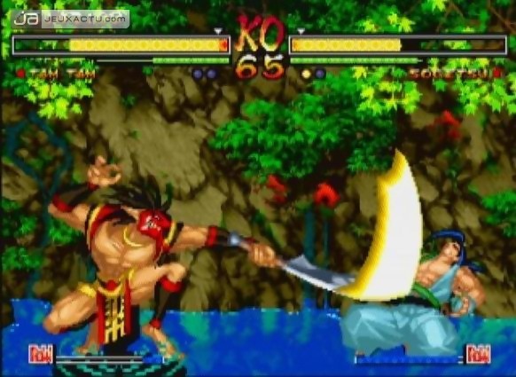 En cas de furie bien placée, l’adversaire verra son arme se briser en deux, l’obligeant ainsi à se battre à mains nues. Celui-ci possède cependant quelques astuces pour renverser une situation délicate, comme la prise d’épée à mains nues pour désarmer son opposant à son tour. Si la situation s’avère perdue, reste alors le suicide qui permet de déclarer forfait pour ensuite repartir avec une jauge de rage pleine au round suivant. Le changement brutal du décor et l’arrêt du timer permettent de dramatiser la situation et de placer les joueurs dans un stress latent. Plutôt efficace. Si les gros coups d’épée enlèvent toujours autant d’énergie, la jauge de vie est désormais repassée à un seul niveau. Cela se traduit ainsi par des matchs de courte durée, d’autant que le sword meter (la barre verte placée sous la jauge de vie) permet dorénavant d’indiquer l’état de la force d’attaque du personnage. Plus celle-ci est élevée et plus les dommages sont importants. Avec un personnage tel que Yoshitora, capable d’arracher un bon tiers d’énergie dans son état normal, soyez assuré de retirer les trois quarts de vie de l’adversaire, une fois son sword meter et sa jauge de rage au maximum. Abusé ? Oui, au même titre que le manque d’innovations qui font de ce Samurai Shodown V un épisode bâclé.