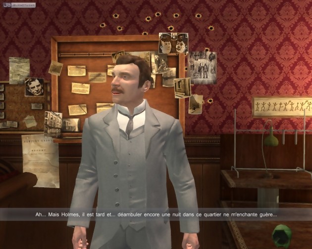Durant sa longue carrière, Sherlock Holmes a croisé le chemin des criminels les plus retors et enquêté sur les affaires les plus obscures. Etant basé à Londres et vivant à la fin du XIXème siècle, il aurait donc tout à fait pu s'intéresser au cas de Jack l'éventreur. Cette confrontation totalement imaginaire et contemporaine (Conan Doyle n'a jamais rien écrit de tel) ne manque finalement pas de pertinence et sert de postulat à un nouveau jeu d'aventure signé Frogwares. Le joueur doit donc enquêter sur des meurtres de prostituées, qui se font de plus en plus nombreux et de plus en plus violents. Pour cela, il prendra le contrôle de Sherlock Holmes, mais aussi celui de son célèbre assistant, le docteur Watson. Entièrement réalisé en 3D temps réel, le jeu laisse le choix entre deux vues très différentes. La première caméra, extérieure, perpétue la grande tradition des "point & click". On y dirige le personnage d'écrans en écrans, à la force du clic de souris. Un système qui a fait ses preuves, mais qui dégage une certaine rigidité. On lui préfèrera donc la vue à la première personne, plus novatrice et plus fluide. A la manière d'un FPS, on dirige alors le personnage librement et rapidement. Voilà qui dynamise grandement l'aventure et dépoussière quelque peu un genre qui a parfois tendance à tourner en rond. Évidemment, le moteur 3D ne saurait rivaliser avec celui des jeux d'action les plus brillants. Les esprits chagrins pourront donc reprocher l'aspect légèrement daté des graphismes, notamment en ce qui concerne les animations. Mais à vrai dire, la qualité générale des modélisations et des textures suffit amplement pour rendre crédibles les différents lieux et personnages affichés. L'ambiance générale est même particulièrement réussie. De l'appartement bourgeois du détective aux ruelles de Whitechapel, aussi crasseuses que dangereuses, on se retrouve plongé en pleine époque victorienne. Loin d'être statiques, les panoramas sont d'ailleurs animés par les déambulations de nombreux passants, qu'on peut même interroger à loisir. Le dialogue qui s'en suit se limite alors généralement à une phrase expéditive, mais après tout, nous ne sommes pas dans un jeu de rôle.