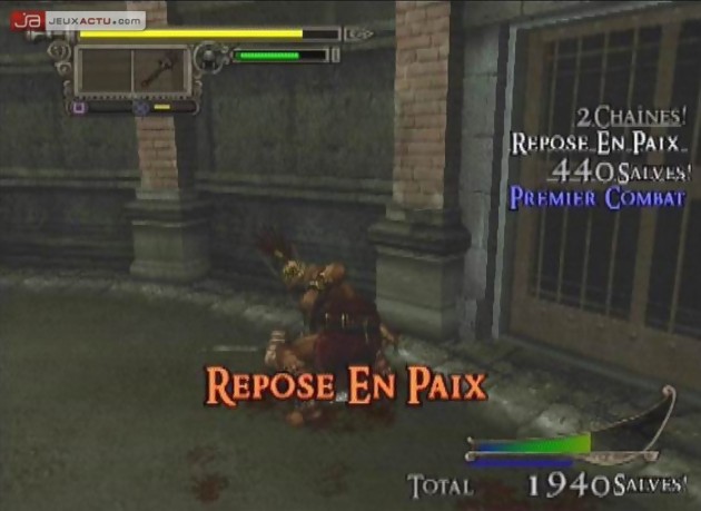 Ces armes bonus sont accessibles quand le compteur de salves (les applaudissements de la foule) atteint une valeur critique. Vous pouvez alors prendre une pose et vous faire acclamer par la foule pour devenir leur champion. Pour vous récompenser, on vous jettera une arme titanesque : épée géante, hallebarde gargantuesque, trident digne de Neptune… Bref, c’est le maxi carnage assuré dans les rangs de vos opposants. Méfiez-vous d’ailleurs de ces derniers qui, non contents de vous être toujours supérieur en nombre, n’hésitent pas à piquer les armes présentes sur le terrain pour s’en servir (eux aussi abîment leur matériel). Dans le registre des objets présents sur le "ring", on trouvera de temps à autre des protections type casque ou de la nourriture pour remonter un peu le niveau de sa barre de vie. Une des astuces du jeu consiste d’ailleurs à se faire acclamer par la foule, même si la barre de salve n’est pas à son apogée, pour obtenir de la nourriture et remonter sa fragile barre de vie. Toujours dans les astuces de combat, il ne faut pas hésiter à achever ses adversaires au sol, à se déplacer dans leur dos, à sortir un combo meurtrier sur un ou plusieurs opposants ou à en projeter un autre sur des pics pour faire monter la jauge de salves et récupérer une arme bénie. Et avec cette arme, les salves montent encore plus vite…La boucle est bouclée, toujours plus de frénésie, toujours plus de combos, toujours plus de sang…