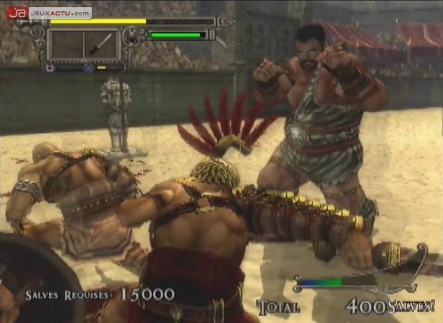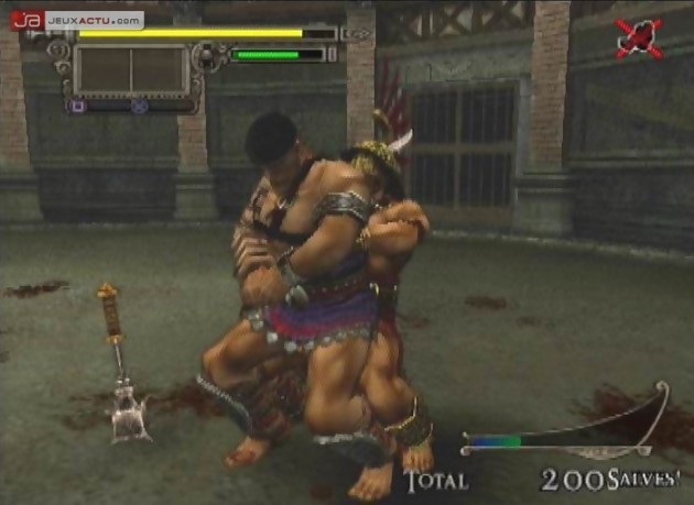 Ces armes bonus sont accessibles quand le compteur de salves (les applaudissements de la foule) atteint une valeur critique. Vous pouvez alors prendre une pose et vous faire acclamer par la foule pour devenir leur champion. Pour vous récompenser, on vous jettera une arme titanesque : épée géante, hallebarde gargantuesque, trident digne de Neptune… Bref, c’est le maxi carnage assuré dans les rangs de vos opposants. Méfiez-vous d’ailleurs de ces derniers qui, non contents de vous être toujours supérieur en nombre, n’hésitent pas à piquer les armes présentes sur le terrain pour s’en servir (eux aussi abîment leur matériel). Dans le registre des objets présents sur le "ring", on trouvera de temps à autre des protections type casque ou de la nourriture pour remonter un peu le niveau de sa barre de vie. Une des astuces du jeu consiste d’ailleurs à se faire acclamer par la foule, même si la barre de salve n’est pas à son apogée, pour obtenir de la nourriture et remonter sa fragile barre de vie. Toujours dans les astuces de combat, il ne faut pas hésiter à achever ses adversaires au sol, à se déplacer dans leur dos, à sortir un combo meurtrier sur un ou plusieurs opposants ou à en projeter un autre sur des pics pour faire monter la jauge de salves et récupérer une arme bénie. Et avec cette arme, les salves montent encore plus vite…La boucle est bouclée, toujours plus de frénésie, toujours plus de combos, toujours plus de sang…