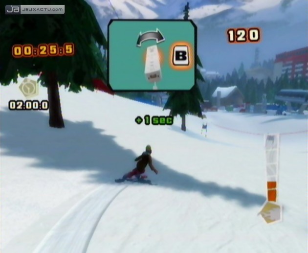 Passons au plus important : la jouabilité, en commençant par la Wiimote. Pas besoin de Nunchuk ici, seule la télécommande est utilisée. Elle symbolise tout simplement votre planche, il suffit de la tenir à l'horizontale pointée vers l'écran. En l'inclinant sur les côtés, on tourne, en la secouant un peu vers le haut, on saute (plus efficacement si on la penche légèrement vers le bas avant pour simuler l'impulsion des jambes). Le bouton A sert à se pencher pour aller plus vite, le B à prendre des virages plus serrés. Les déplacements sont très simples et franchement, on s'habitue très vite à cette prise en main très instinctive. Pour les figures, il suffit d'agiter ou d’incliner la Wiimote dans certaines directions en maintenant A, B ou les deux à la fois lors des sauts. Mais attention, pour valider les points, il faut veiller à bien atterrir pour ne pas tomber ! Pour cela, vous devez incliner la télécommande afin d'aligner la planche avec la piste, avec l'espoir de gagner un bonus de 10% si votre plaquage au sol est parfait. Après un très léger temps d'adaptation, on arrive à faire à peu près ce que l'on veut même si on ne peut éviter certaines imprécisions jamais bien méchantes. Reste que c'est très fun et que cette jouabilité procure d'excellentes sensations. Contrairement à ce qu'on pourrait penser, ça ne fait pas mal au poignet (à moins de jouer 3 heures de suite évidemment !). A ce niveau-là, on peut donc déjà dire que Shaun White Snowboarding : Road Trip est une réussite, mais il existe une autre façon d'y jouer...